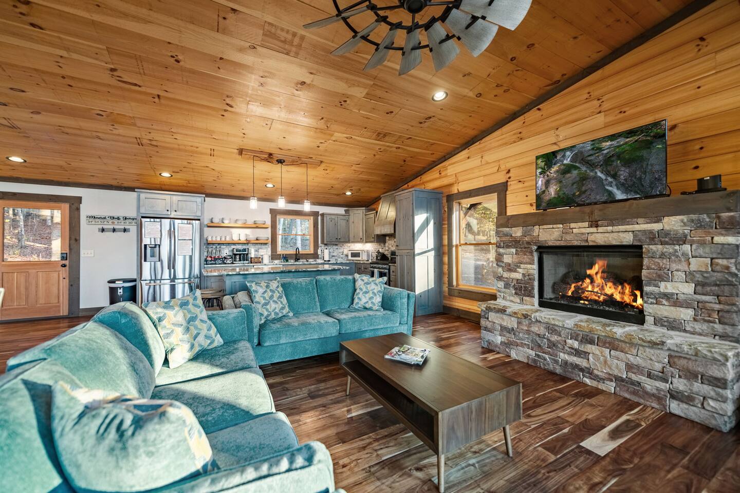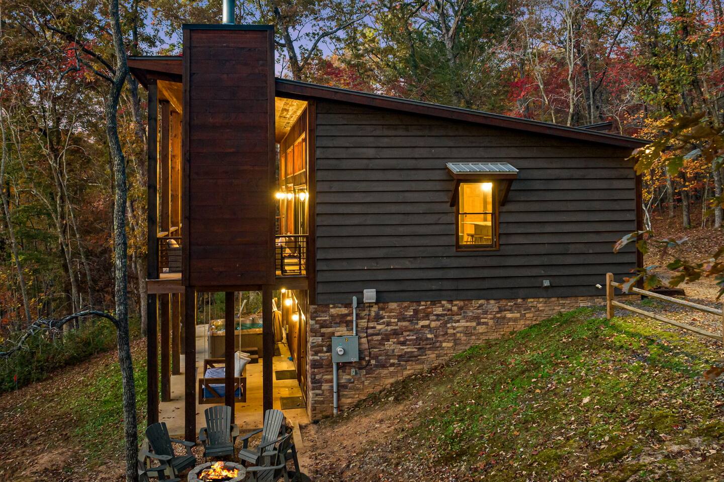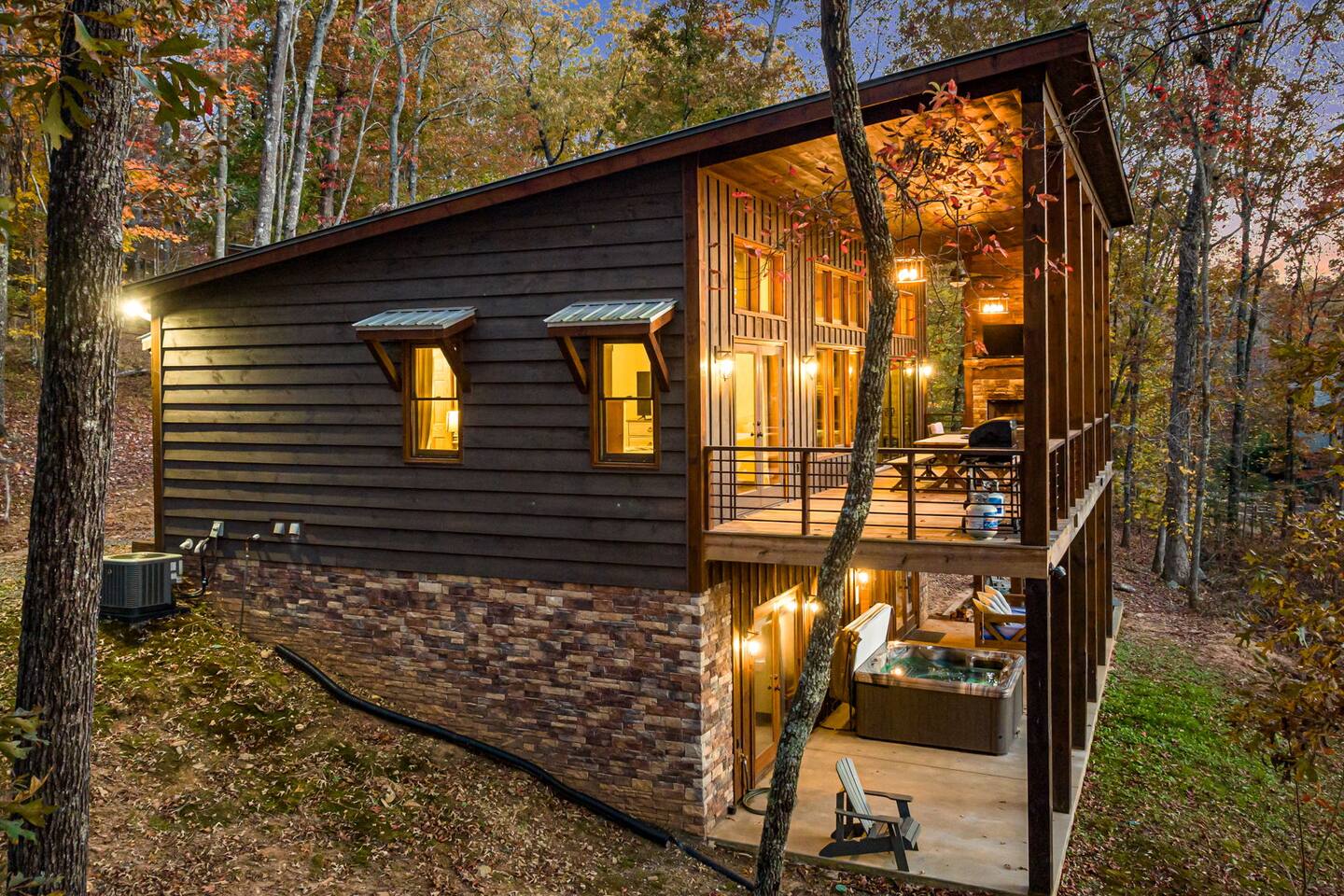 Brand new modern chalet just minutes from Blue Ridge. This 3-bedroom chalet offers 3 full-size bathrooms, a half bath and room for 8, along with a convenient location about 10 miles (15 min) from downtown Blue Ridge. That means easy access to all the wonderful attractions and splendor of Blue Ridge while enjoying the privacy and seclusion of Mineral Bluff. Featuring high speed Wi-Fi, Hot Tub, Cable TV, and a large deck with a fireplace to enjoy all those cool nights with family and friends.