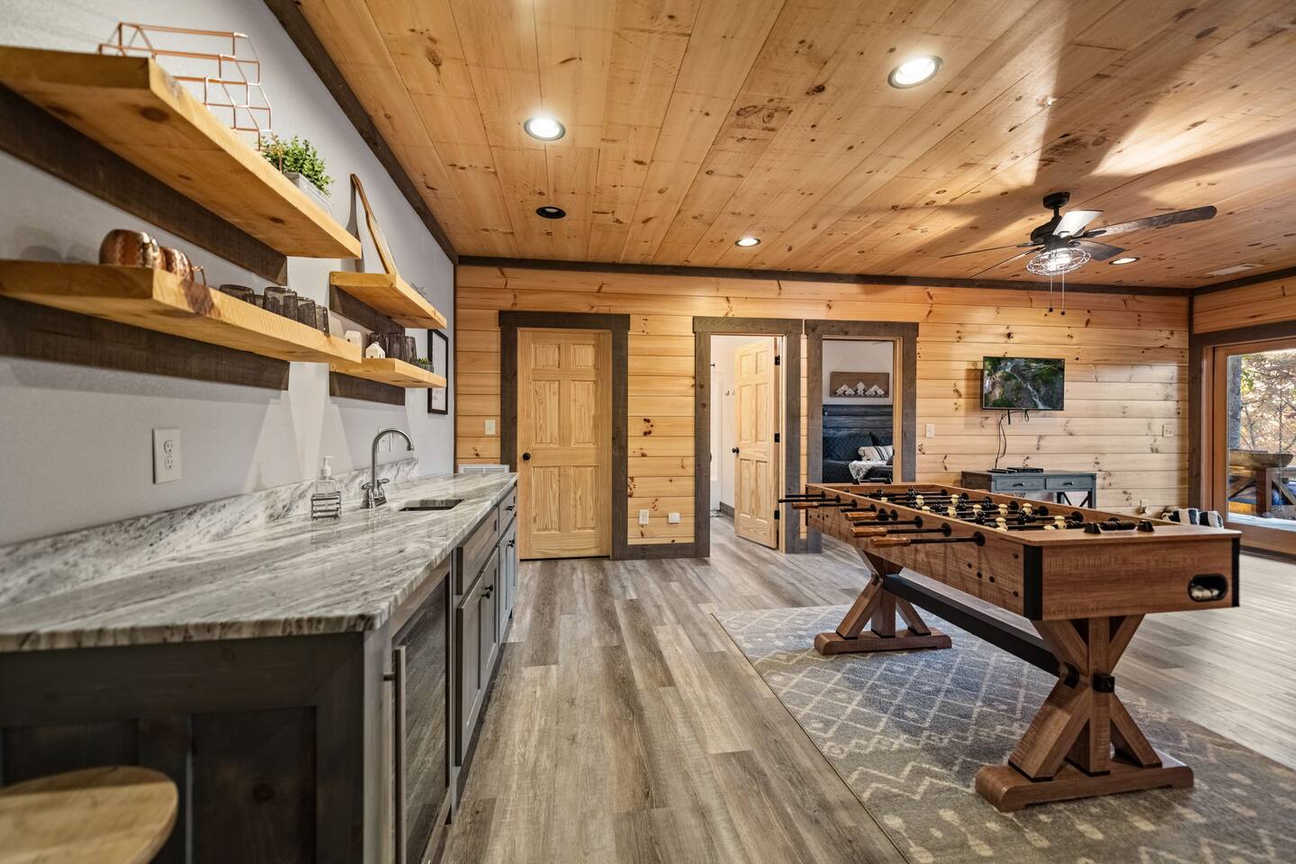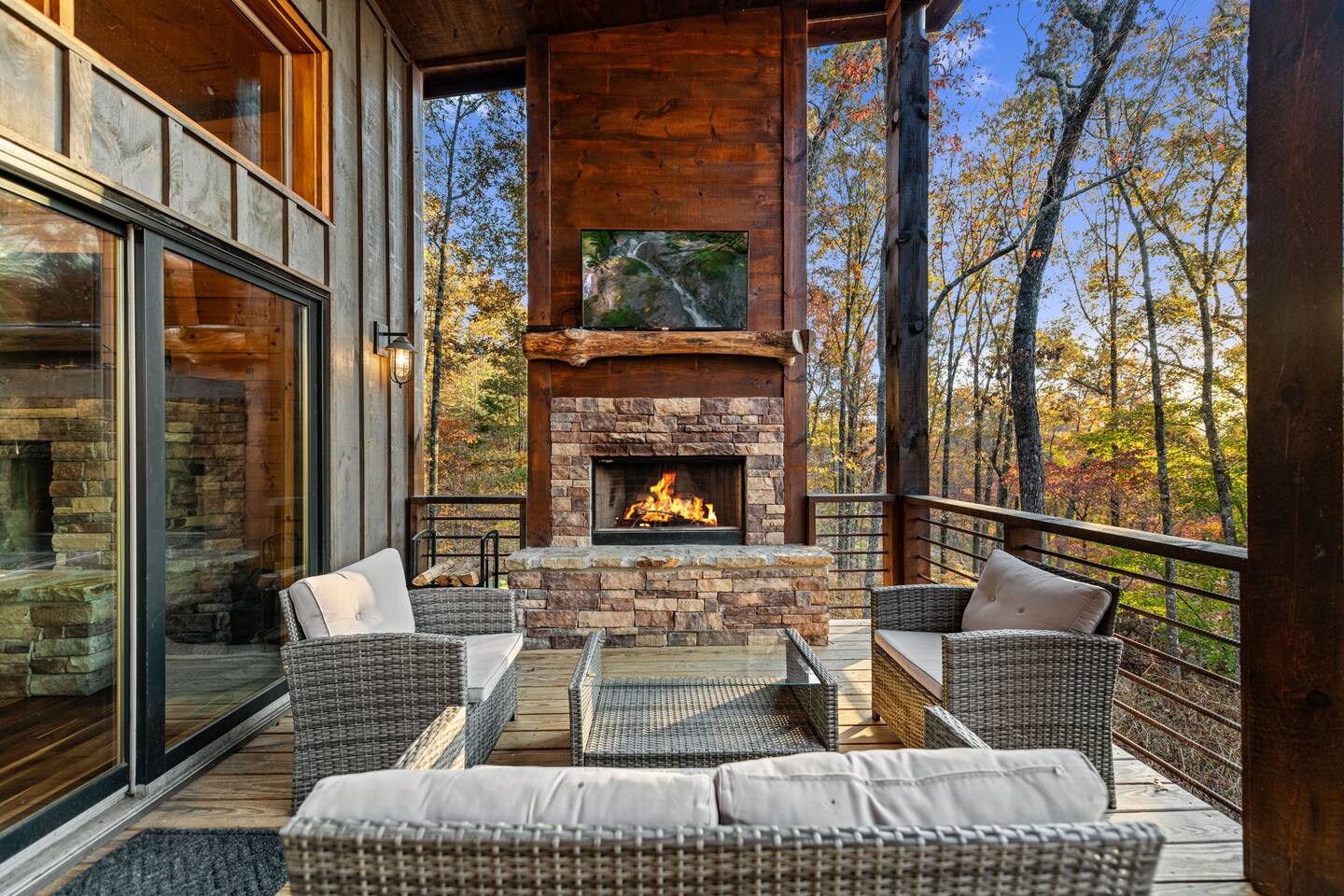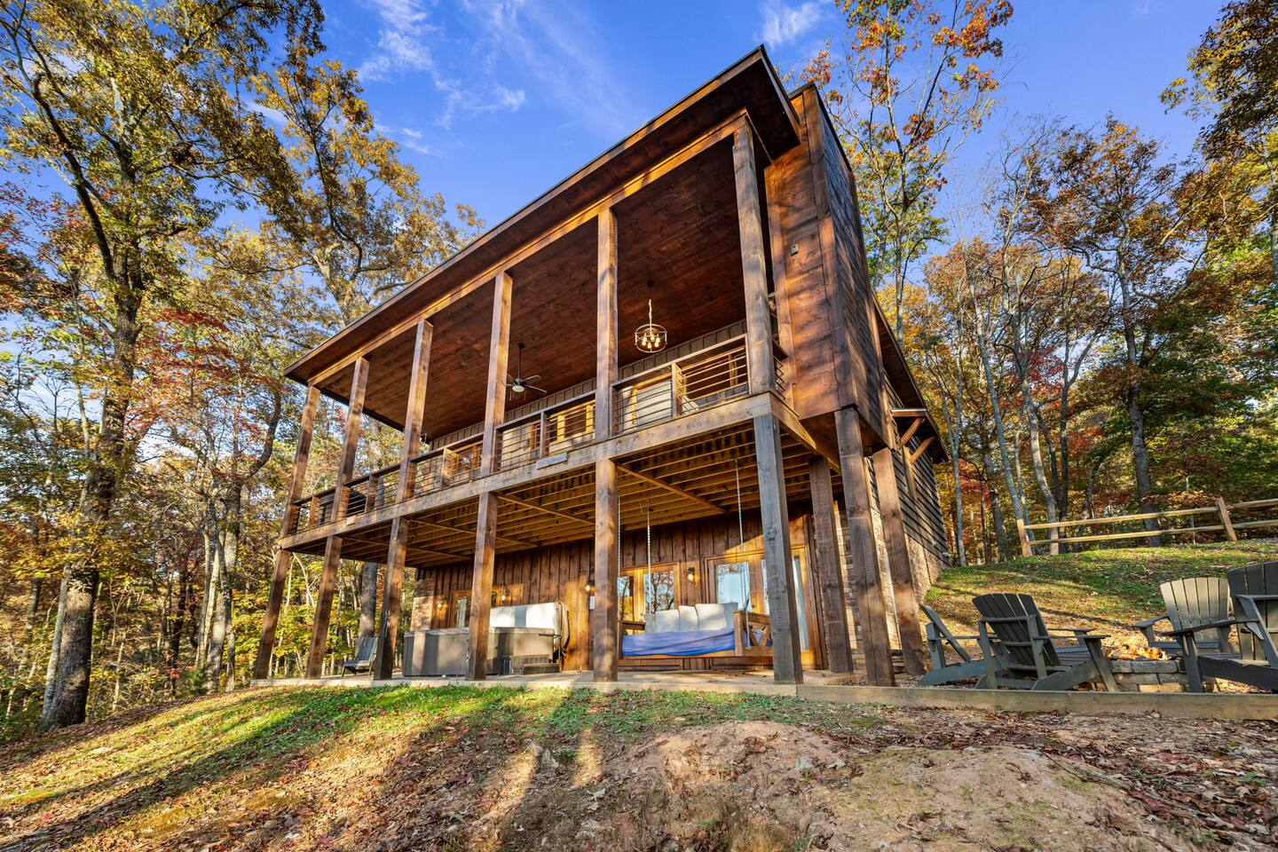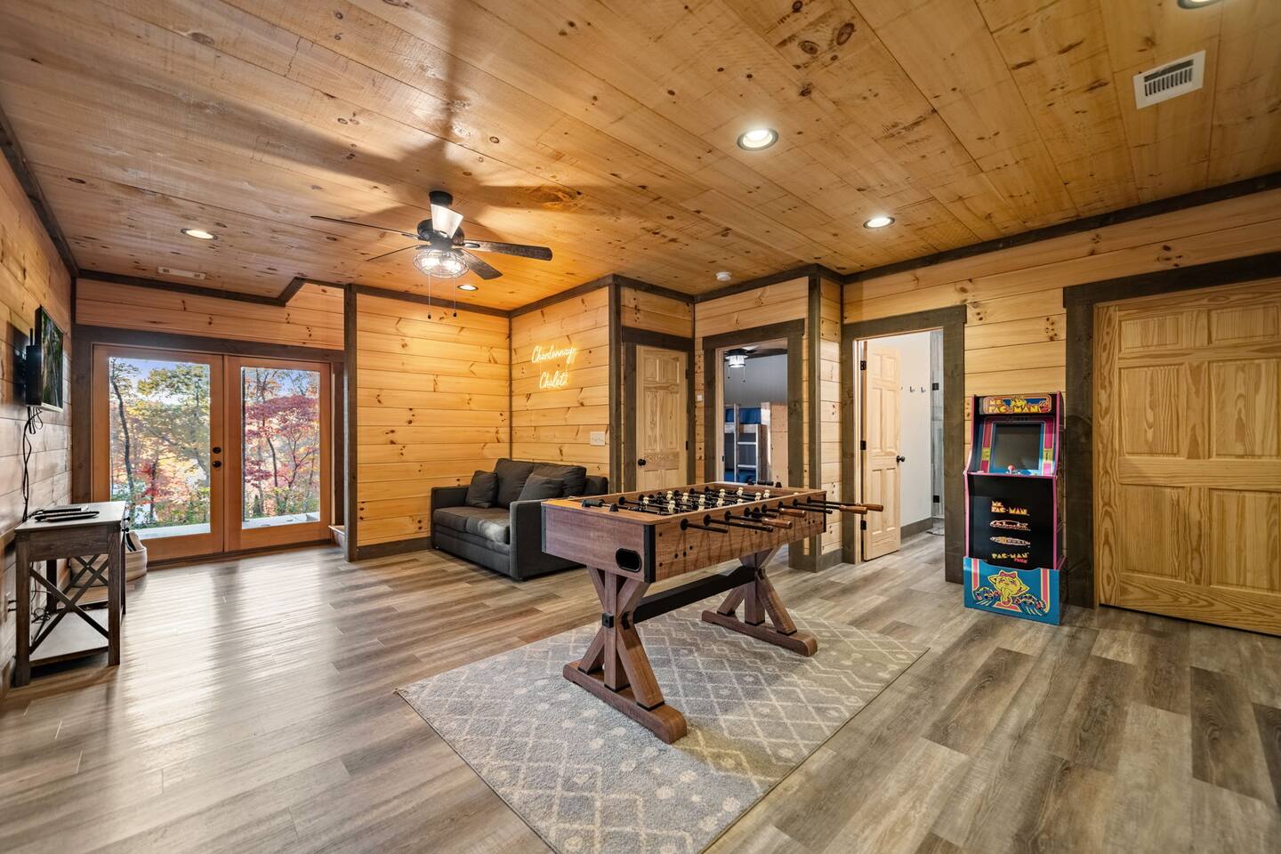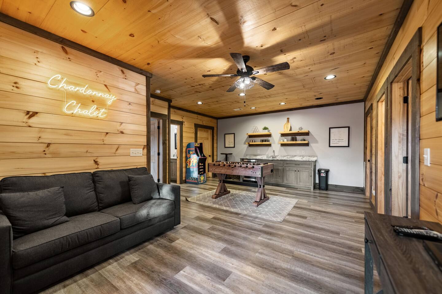 Features • 3 Bed/3.5 Bathroom Chalet - Sleeps 8 • Outdoor Hot Tub - Seats 5 • Indoor Gas Fireplace/Outdoor Wood Fireplace • Large Deck for entertaining • Cable TV and High Speed Wi-Fi • Parking for 3 vehicles • 15 Minutes from Blue Ridge • Dog Friendly - 2 Max (75 lb. limit) Located in Mineral Bluff, Chardonnay Chalet is approximately 15 minutes from Blue Ridge. A gravel road leads up a hill to the chalet where your wonderful vacation awaits. Available parking for up to 3 vehicles. This 3 bedroom, 3.5 bath chalet that sleeps 8 is 2 levels. There are a small set of stairs that lead up to the covered porch. On this level, you will find a fully equipped kitchen with a large island just waiting to be used those large family meals. The open floor plan living area features a couch, 2 chairs, and a TV above the gas fireplace. The room is finished off with a dinning table that can seat 6. Also on this level is the powder room and full washer/dryer. The master bedroom is right off the main living space and includes a King bed with TV and features an attached bathroom. The bathroom features dual vanities and a gorgeously tiled shower with a rainfall head. As you descend into the lower level you will enter the game room. Here you will find the wet bar as well as several entertainment items (TV, foosball, arcade, etc.). You will also find a pull out sofa that makes into a Full sized bed. Off the game room you will find two additional bedrooms. The first includes two bunked Twin beds with a TV. The second is a King with a TV. There are two full baths on the lower level. The first features a tub while the other is a full shower enclosure. All tastefully decorated and ready for your enjoyment. Outside on the main level there is a large deck that offers several seating options, a picnic table, as well as the relaxing wood burning fireplace with TV. Offering beautiful wooded views any time of the year. On the lower level you will find the beautiful hot tub, relaxing daybed swing, and outdoor fire pit to help keep you warm on those cold fall nights. If you are looking for the perfect place to gather with friends or family, minutes away from all of the area attractions, Chardonnay Chalet would be your ideal vacation haven. Don't miss out --- book this modern, beautiful chalet today!