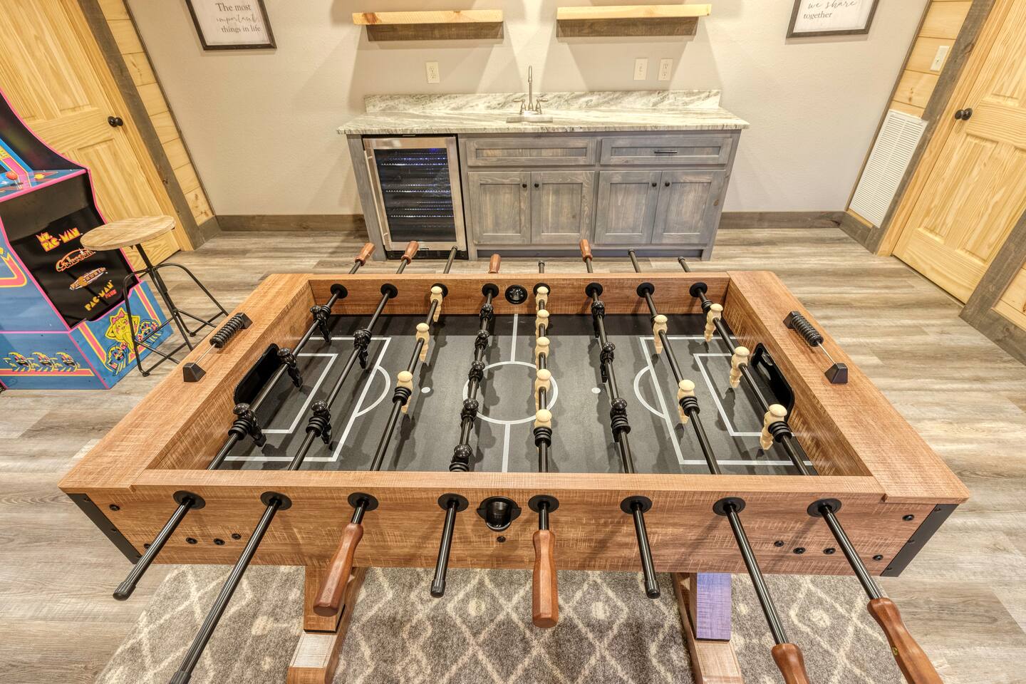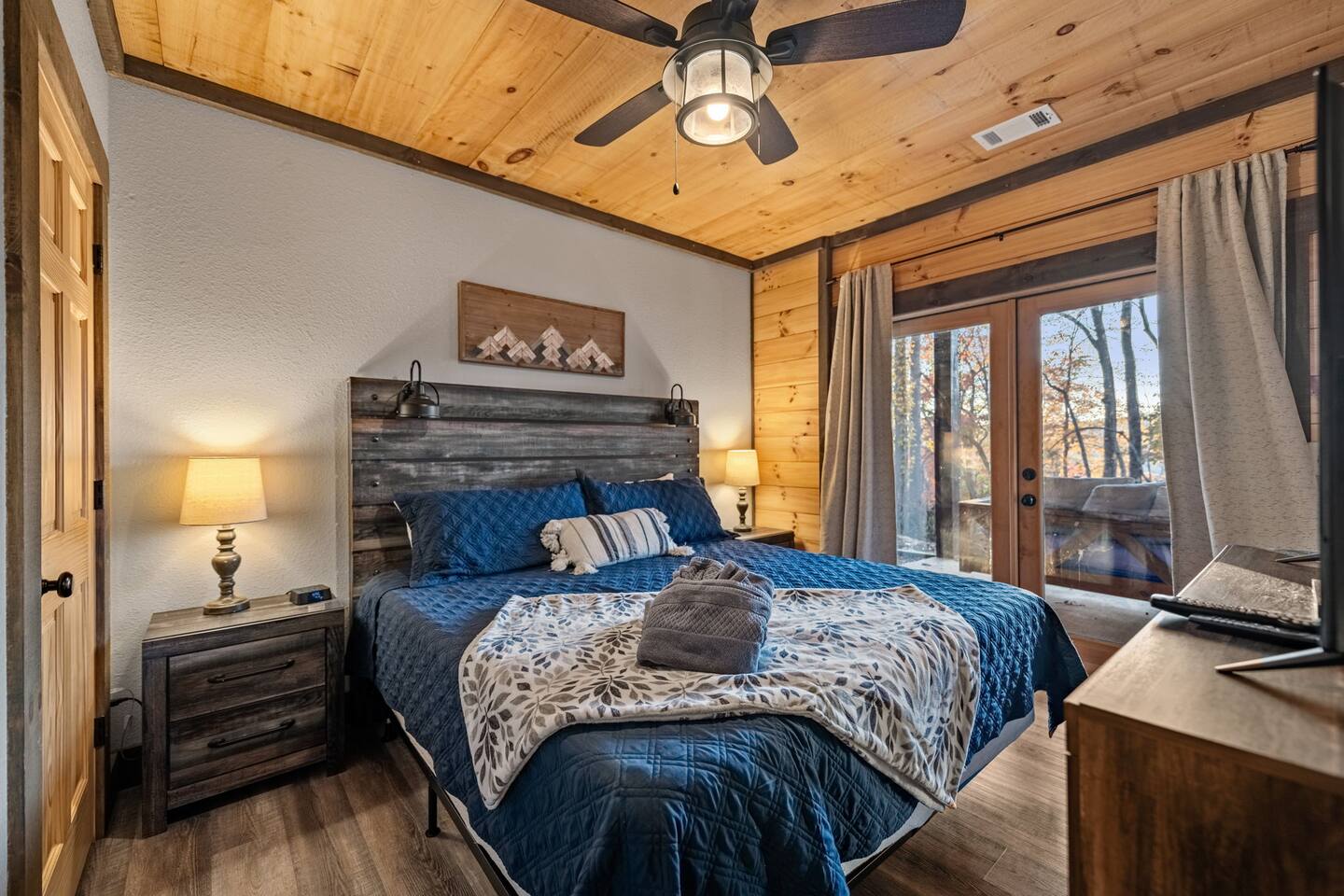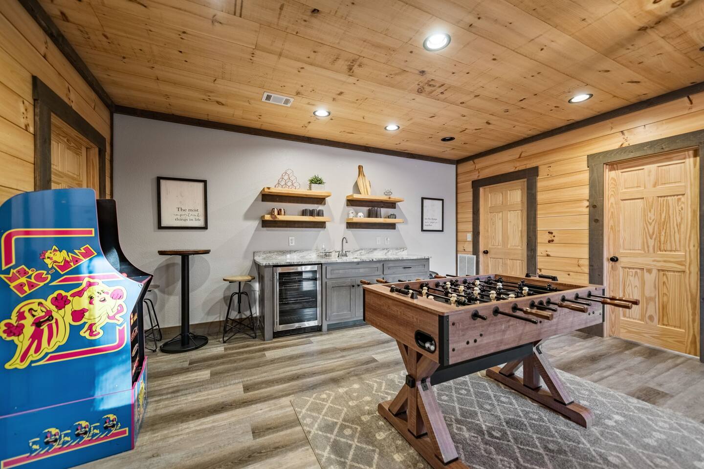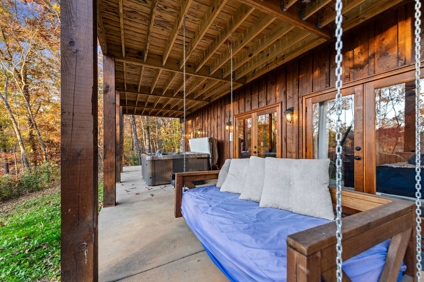 Features • 3 Bed/3.5 Bathroom Chalet - Sleeps 8 • Outdoor Hot Tub - Seats 5 • Indoor Gas Fireplace/Outdoor Wood Fireplace • Large Deck for entertaining • Cable TV and High Speed Wi-Fi • Parking for 3 vehicles • 15 Minutes from Blue Ridge • Dog Friendly - 2 Max (75 lb. limit) Located in Mineral Bluff, Chardonnay Chalet is approximately 15 minutes from Blue Ridge. A gravel road leads up a hill to the chalet where your wonderful vacation awaits. Available parking for up to 3 vehicles. This 3 bedroom, 3.5 bath chalet that sleeps 8 is 2 levels. There are a small set of stairs that lead up to the covered porch. On this level, you will find a fully equipped kitchen with a large island just waiting to be used those large family meals. The open floor plan living area features a couch, 2 chairs, and a TV above the gas fireplace. The room is finished off with a dinning table that can seat 6. Also on this level is the powder room and full washer/dryer. The master bedroom is right off the main living space and includes a King bed with TV and features an attached bathroom. The bathroom features dual vanities and a gorgeously tiled shower with a rainfall head. As you descend into the lower level you will enter the game room. Here you will find the wet bar as well as several entertainment items (TV, foosball, arcade, etc.). You will also find a pull out sofa that makes into a Full sized bed. Off the game room you will find two additional bedrooms. The first includes two bunked Twin beds with a TV. The second is a King with a TV. There are two full baths on the lower level. The first features a tub while the other is a full shower enclosure. All tastefully decorated and ready for your enjoyment. Outside on the main level there is a large deck that offers several seating options, a picnic table, as well as the relaxing wood burning fireplace with TV. Offering beautiful wooded views any time of the year. On the lower level you will find the beautiful hot tub, relaxing daybed swing, and outdoor fire pit to help keep you warm on those cold fall nights. If you are looking for the perfect place to gather with friends or family, minutes away from all of the area attractions, Chardonnay Chalet would be your ideal vacation haven. Don't miss out --- book this modern, beautiful chalet today!