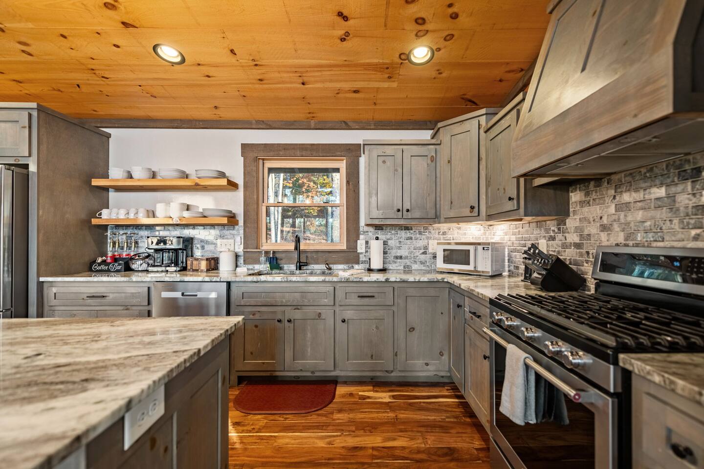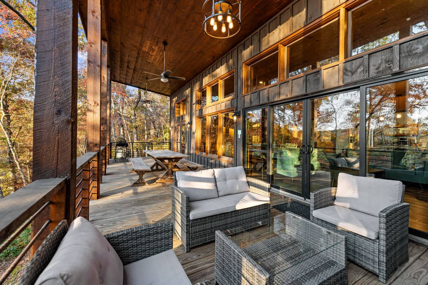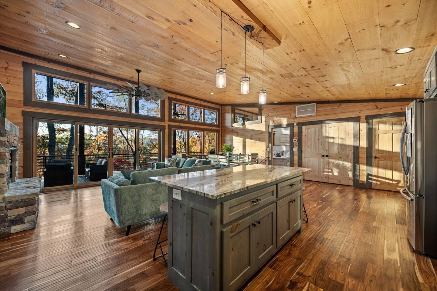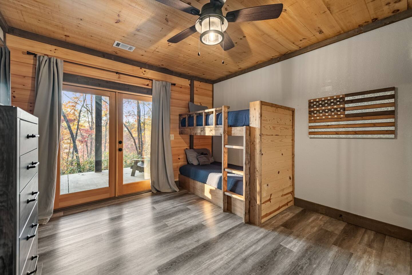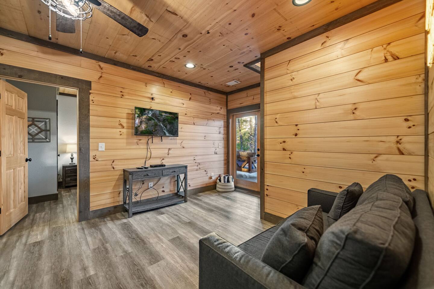 Features • 3 Bed/3.5 Bathroom Chalet - Sleeps 8 • Outdoor Hot Tub - Seats 5 • Indoor Gas Fireplace/Outdoor Wood Fireplace • Large Deck for entertaining • Cable TV and High Speed Wi-Fi • Parking for 3 vehicles • 15 Minutes from Blue Ridge • Dog Friendly - 2 Max (75 lb. limit) Located in Mineral Bluff, Chardonnay Chalet is approximately 15 minutes from Blue Ridge. A gravel road leads up a hill to the chalet where your wonderful vacation awaits. Available parking for up to 3 vehicles. This 3 bedroom, 3.5 bath chalet that sleeps 8 is 2 levels. There are a small set of stairs that lead up to the covered porch. On this level, you will find a fully equipped kitchen with a large island just waiting to be used those large family meals. The open floor plan living area features a couch, 2 chairs, and a TV above the gas fireplace. The room is finished off with a dinning table that can seat 6. Also on this level is the powder room and full washer/dryer. The master bedroom is right off the main living space and includes a King bed with TV and features an attached bathroom. The bathroom features dual vanities and a gorgeously tiled shower with a rainfall head. As you descend into the lower level you will enter the game room. Here you will find the wet bar as well as several entertainment items (TV, foosball, arcade, etc.). You will also find a pull out sofa that makes into a Full sized bed. Off the game room you will find two additional bedrooms. The first includes two bunked Twin beds with a TV. The second is a King with a TV. There are two full baths on the lower level. The first features a tub while the other is a full shower enclosure. All tastefully decorated and ready for your enjoyment. Outside on the main level there is a large deck that offers several seating options, a picnic table, as well as the relaxing wood burning fireplace with TV. Offering beautiful wooded views any time of the year. On the lower level you will find the beautiful hot tub, relaxing daybed swing, and outdoor fire pit to help keep you warm on those cold fall nights. If you are looking for the perfect place to gather with friends or family, minutes away from all of the area attractions, Chardonnay Chalet would be your ideal vacation haven. Don't miss out --- book this modern, beautiful chalet today!