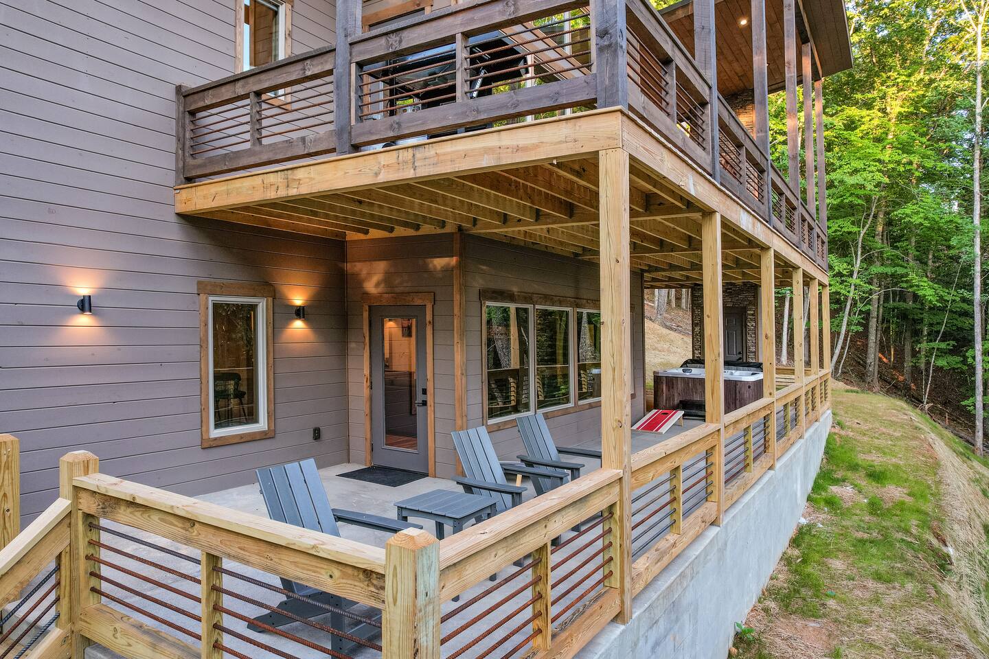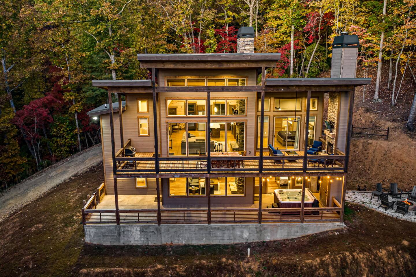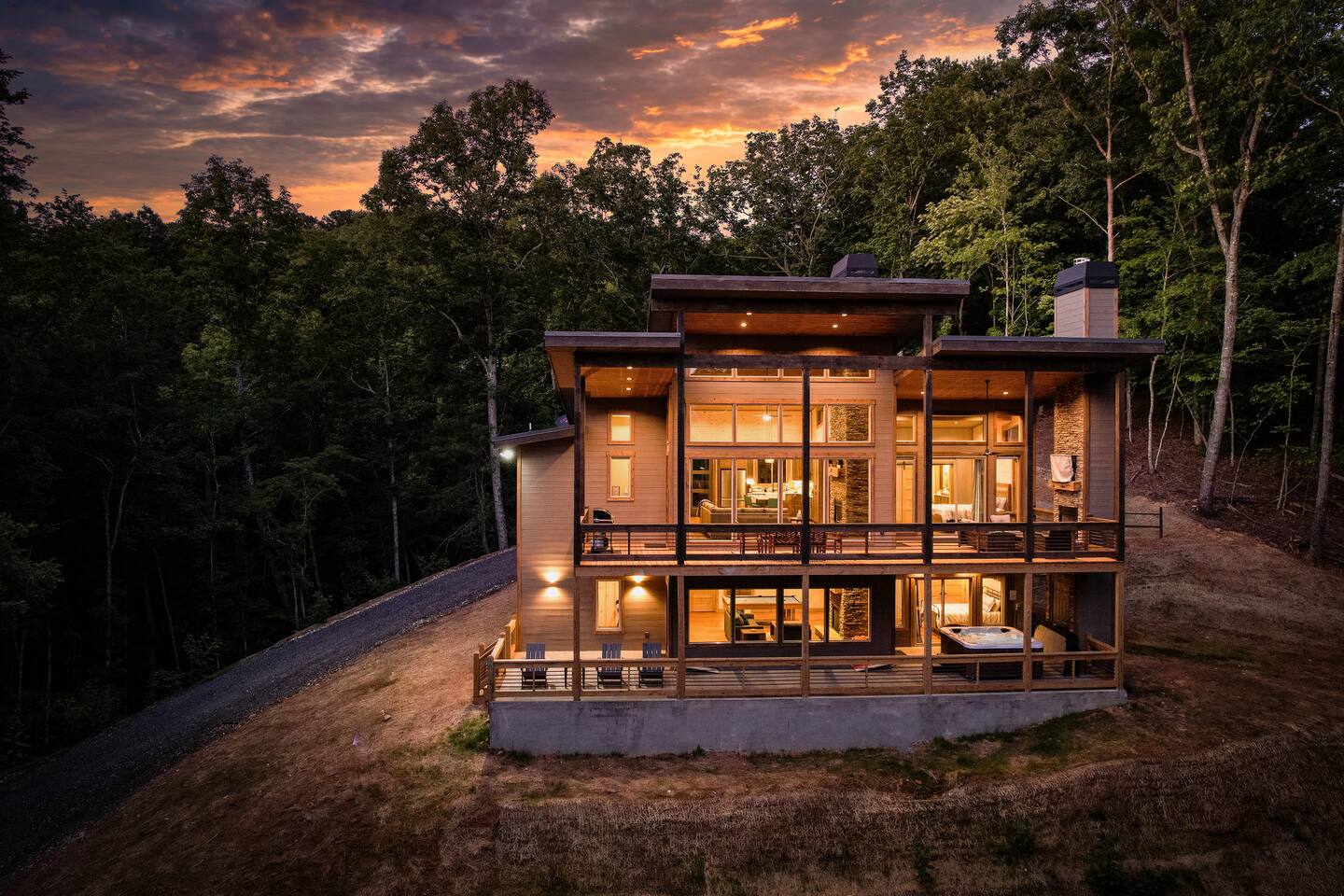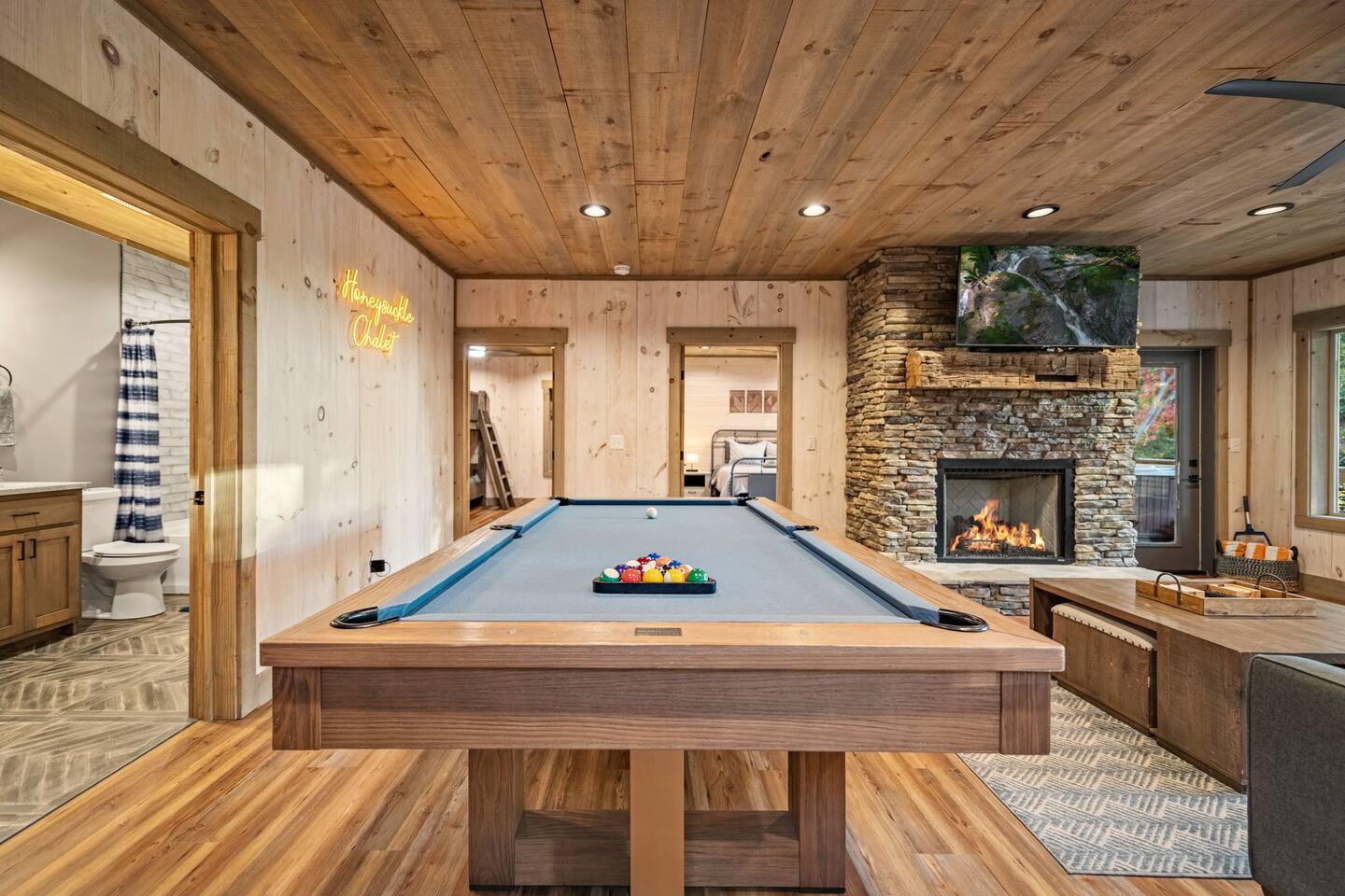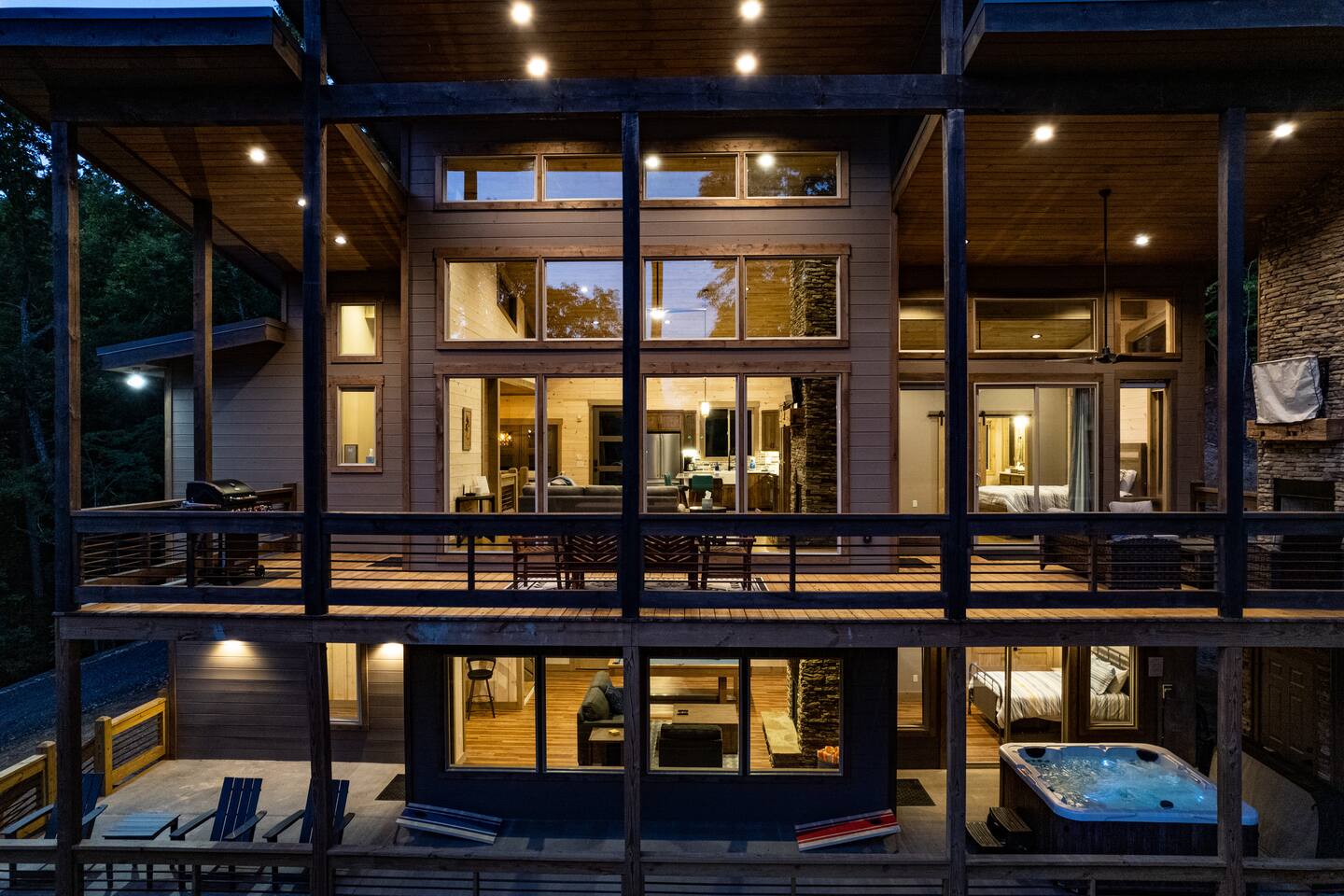 Features • 3 Bed/2.5 Bathroom Chalet - Sleeps 10 • Outdoor Hot Tub - Seats 7 • Game Room w/ Pool Table, Bar, and TV • 2 Gas Fireplaces, Outdoor Wood Burning Fireplace, Fire Pit • Large Deck for entertaining • Satellite TV and Cellular Wi-Fi • Parking for 3-4 vehicles • 15 Minutes from Blue Ridge Located in Morganton, Honeysuckle Chalet is approximately 15 minutes from Blue Ridge and Blairsville. A gravel road leads up a hill to the chalet where your wonderful vacation awaits. Available parking for up to 3-4 vehicles. This 3 bedroom, 2.5 bath chalet that sleeps 9 is 2 levels. There are a small set of stairs that lead up to the covered porch. As you enter your breath will be taken away by the amazing views from the main floor windows. On this level, you will find a fully equipped kitchen with quartz countertops, luxury Italian appliances, a large island just waiting to be used those big family meals. The open floor plan living area features large couch and a TV above the 20 ft. stone stacked gas fireplace. The room is finished off with a modern dinning table that can seat 6. Just off the living space you will find the powder room and laundry room featuring a full washer/dryer. The master bedroom is right off the main living space and includes a King bed with TV and features an attached bathroom. The bathroom features dual vanities and a gorgeously tiled shower with a rainfall head. The the glass sliding doors will lead you right into the outdoor entertainment area. As you descend into the lower level you will enter the game room. Here you will find the wet bar as well as several entertainment items including a pool table, TV, board games and cornhole. You will also find a pull out sofa that makes into a Queen sized bed. Off the game room you will find two additional bedrooms. The first includes a custom built bunk bed with sleep for 4 (all twins) and their own TV. The second is a Queen with a TV. There is a full bathroom right off the game room featuring dual vanities and a shower/tub combo. All tastefully decorated and ready for your enjoyment. Outside on the main level there is a large deck that offers several seating options, an outdoor table and chairs that seats six, as well as the relaxing wood burning fireplace with TV. Offering beautiful wooded views and partial mountain views any time of the year. On the lower level you will find the beautiful hot tub and several anorak chairs for full relaxation. If you are looking for the perfect place to gather with friends or family, minutes away from all of the area attractions, Honeysuckle Chalet would be your ideal vacation haven. Don't miss out --- book this modern, beautiful chalet today!