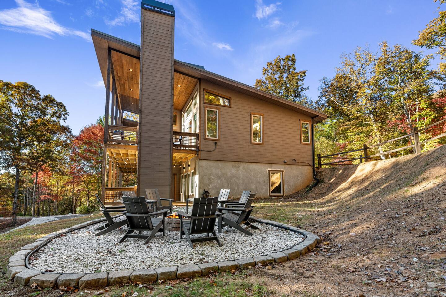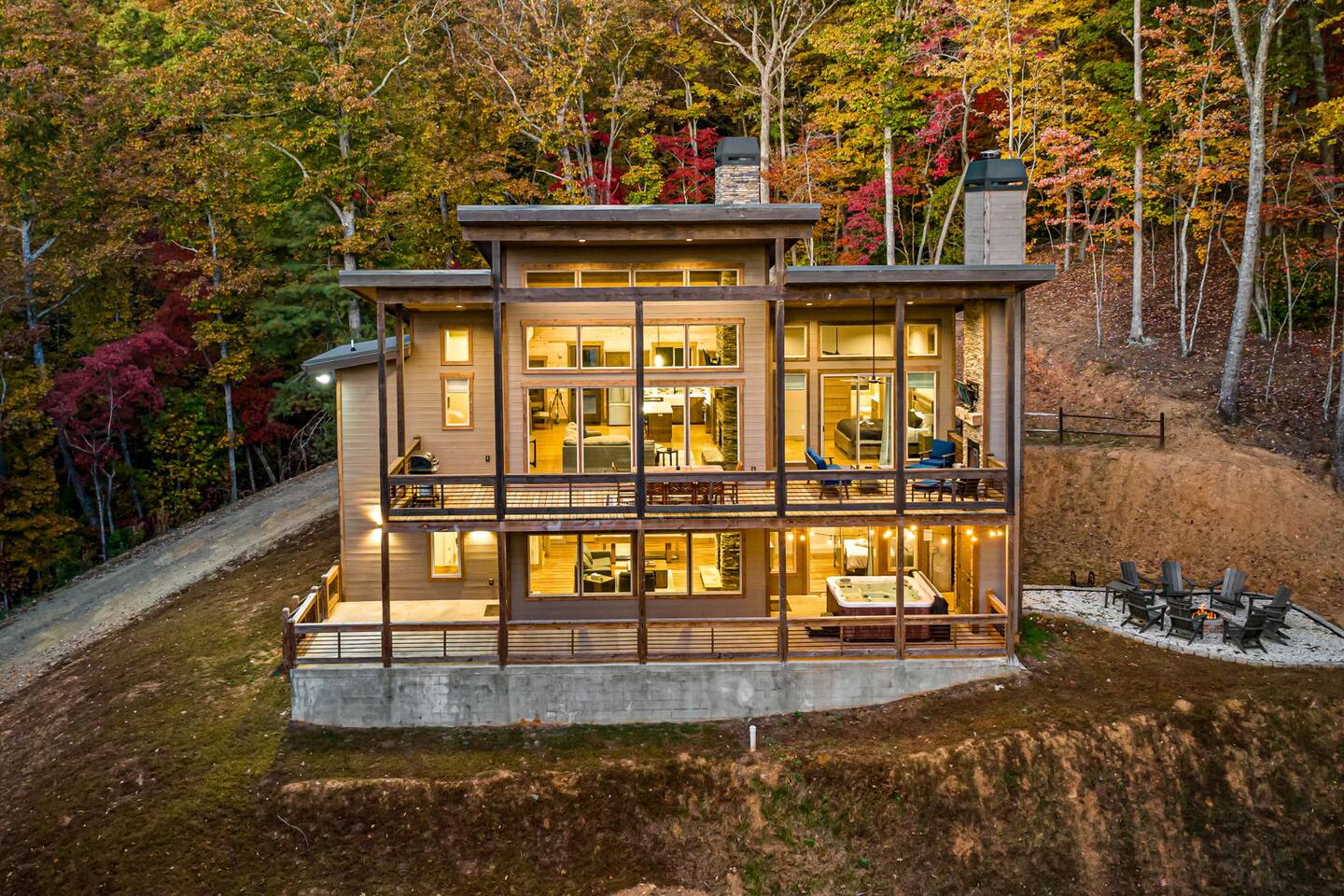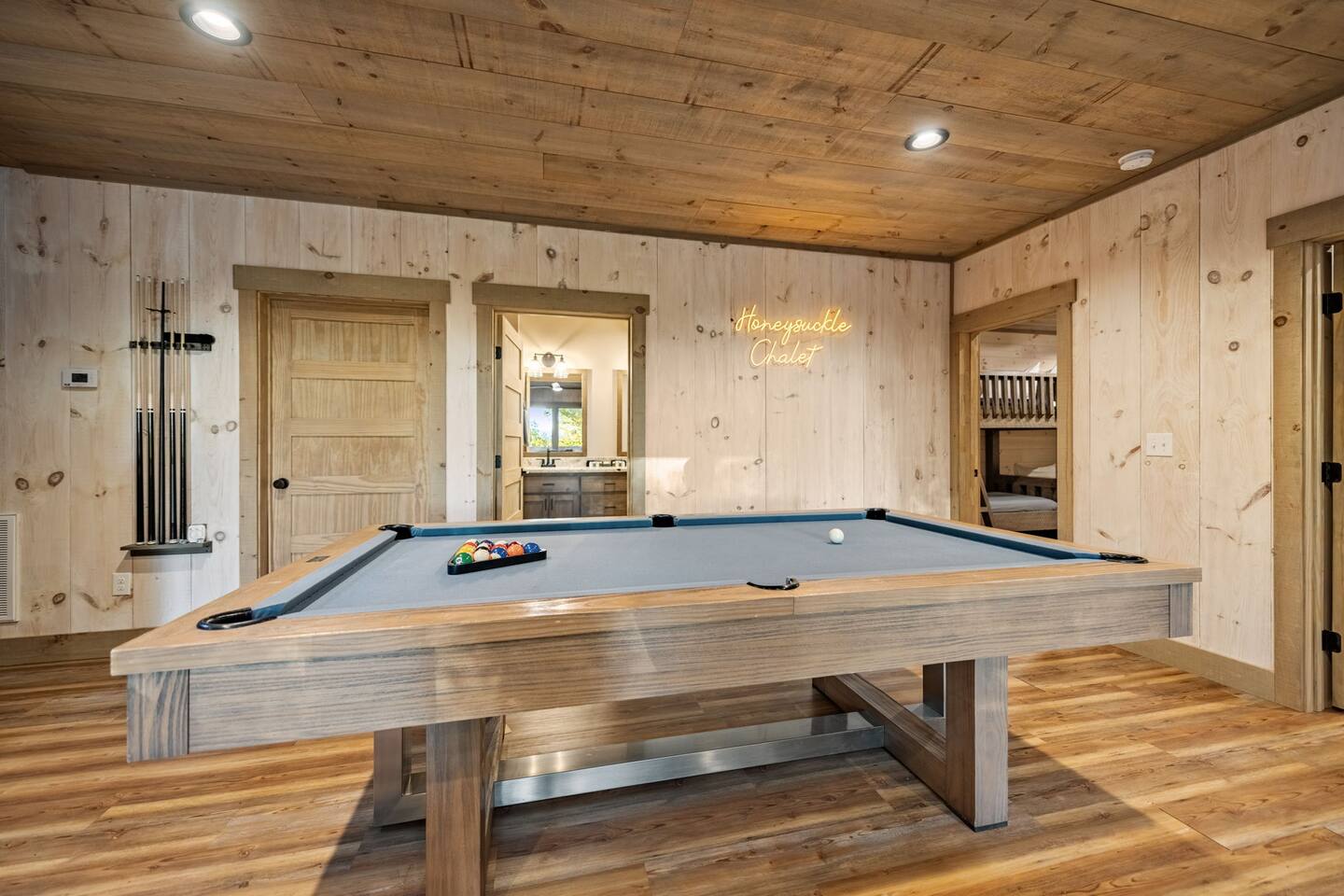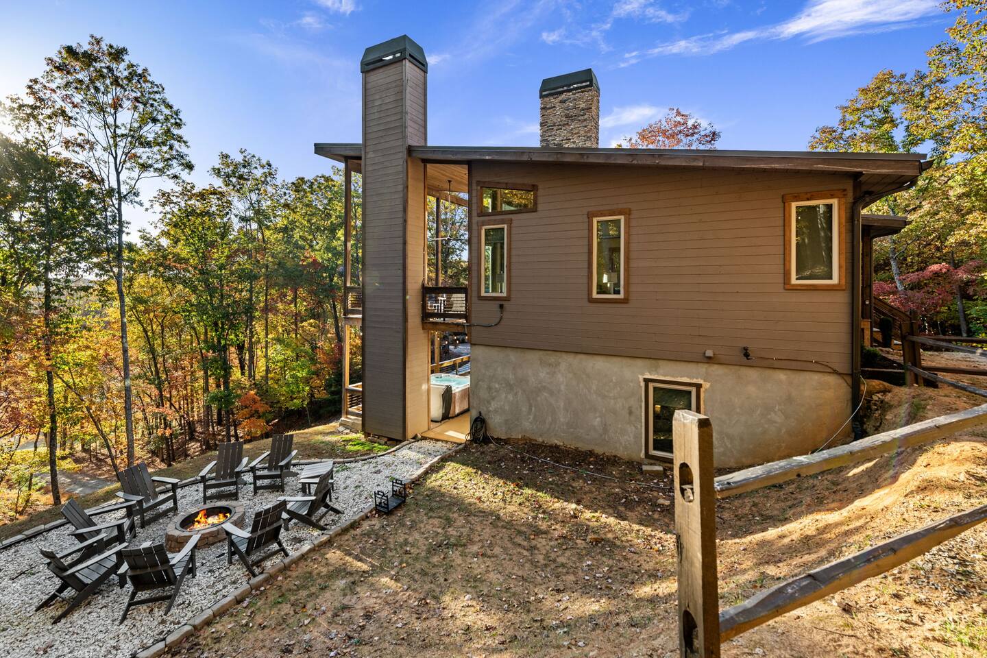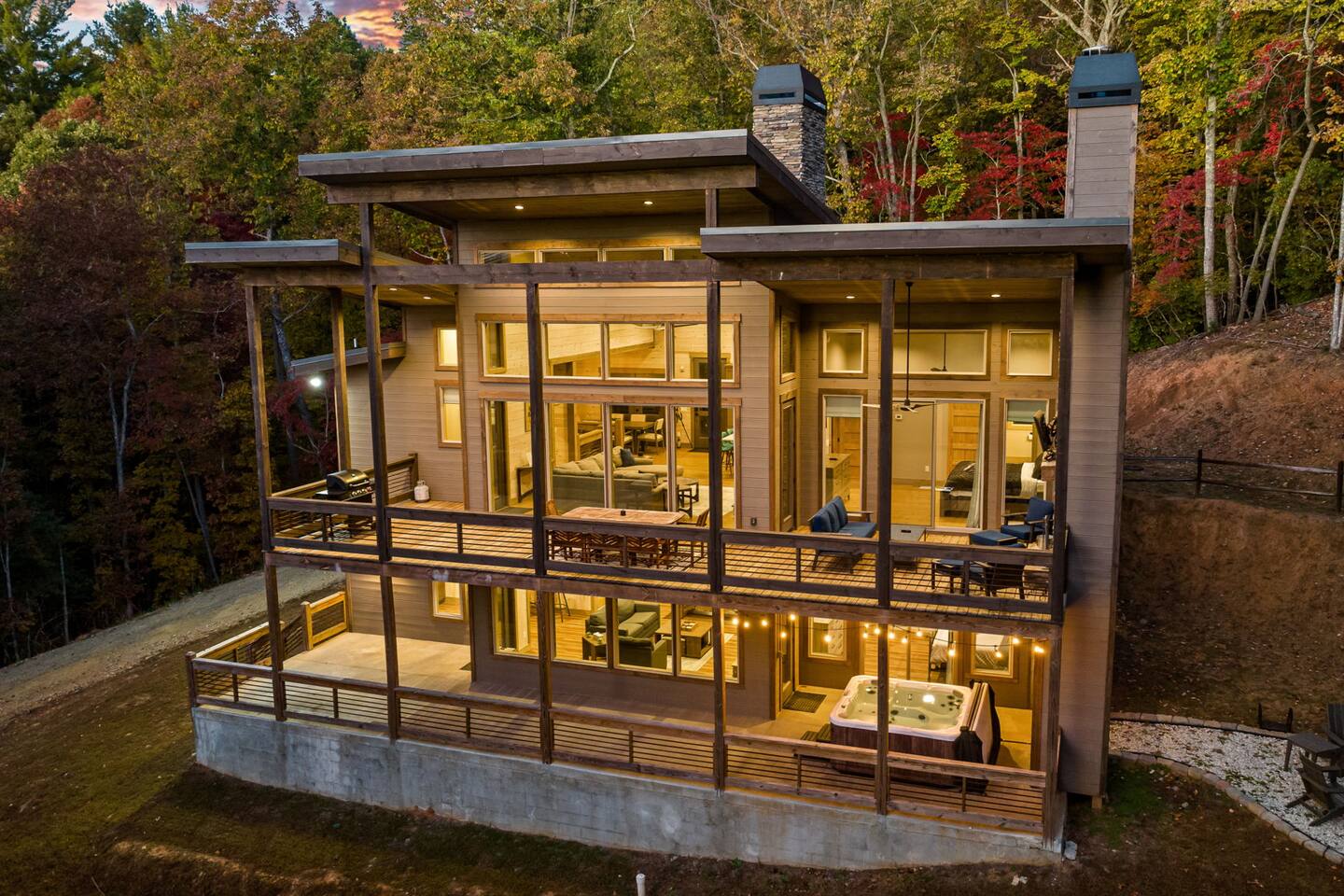 Features • 3 Bed/2.5 Bathroom Chalet - Sleeps 10 • Outdoor Hot Tub - Seats 7 • Game Room w/ Pool Table, Bar, and TV • 2 Gas Fireplaces, Outdoor Wood Burning Fireplace, Fire Pit • Large Deck for entertaining • Satellite TV and Cellular Wi-Fi • Parking for 3-4 vehicles • 15 Minutes from Blue Ridge Located in Morganton, Honeysuckle Chalet is approximately 15 minutes from Blue Ridge and Blairsville. A gravel road leads up a hill to the chalet where your wonderful vacation awaits. Available parking for up to 3-4 vehicles. This 3 bedroom, 2.5 bath chalet that sleeps 9 is 2 levels. There are a small set of stairs that lead up to the covered porch. As you enter your breath will be taken away by the amazing views from the main floor windows. On this level, you will find a fully equipped kitchen with quartz countertops, luxury Italian appliances, a large island just waiting to be used those big family meals. The open floor plan living area features large couch and a TV above the 20 ft. stone stacked gas fireplace. The room is finished off with a modern dinning table that can seat 6. Just off the living space you will find the powder room and laundry room featuring a full washer/dryer. The master bedroom is right off the main living space and includes a King bed with TV and features an attached bathroom. The bathroom features dual vanities and a gorgeously tiled shower with a rainfall head. The the glass sliding doors will lead you right into the outdoor entertainment area. As you descend into the lower level you will enter the game room. Here you will find the wet bar as well as several entertainment items including a pool table, TV, board games and cornhole. You will also find a pull out sofa that makes into a Queen sized bed. Off the game room you will find two additional bedrooms. The first includes a custom built bunk bed with sleep for 4 (all twins) and their own TV. The second is a Queen with a TV. There is a full bathroom right off the game room featuring dual vanities and a shower/tub combo. All tastefully decorated and ready for your enjoyment. Outside on the main level there is a large deck that offers several seating options, an outdoor table and chairs that seats six, as well as the relaxing wood burning fireplace with TV. Offering beautiful wooded views and partial mountain views any time of the year. On the lower level you will find the beautiful hot tub and several anorak chairs for full relaxation. If you are looking for the perfect place to gather with friends or family, minutes away from all of the area attractions, Honeysuckle Chalet would be your ideal vacation haven. Don't miss out --- book this modern, beautiful chalet today!