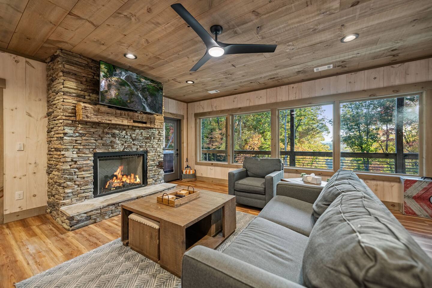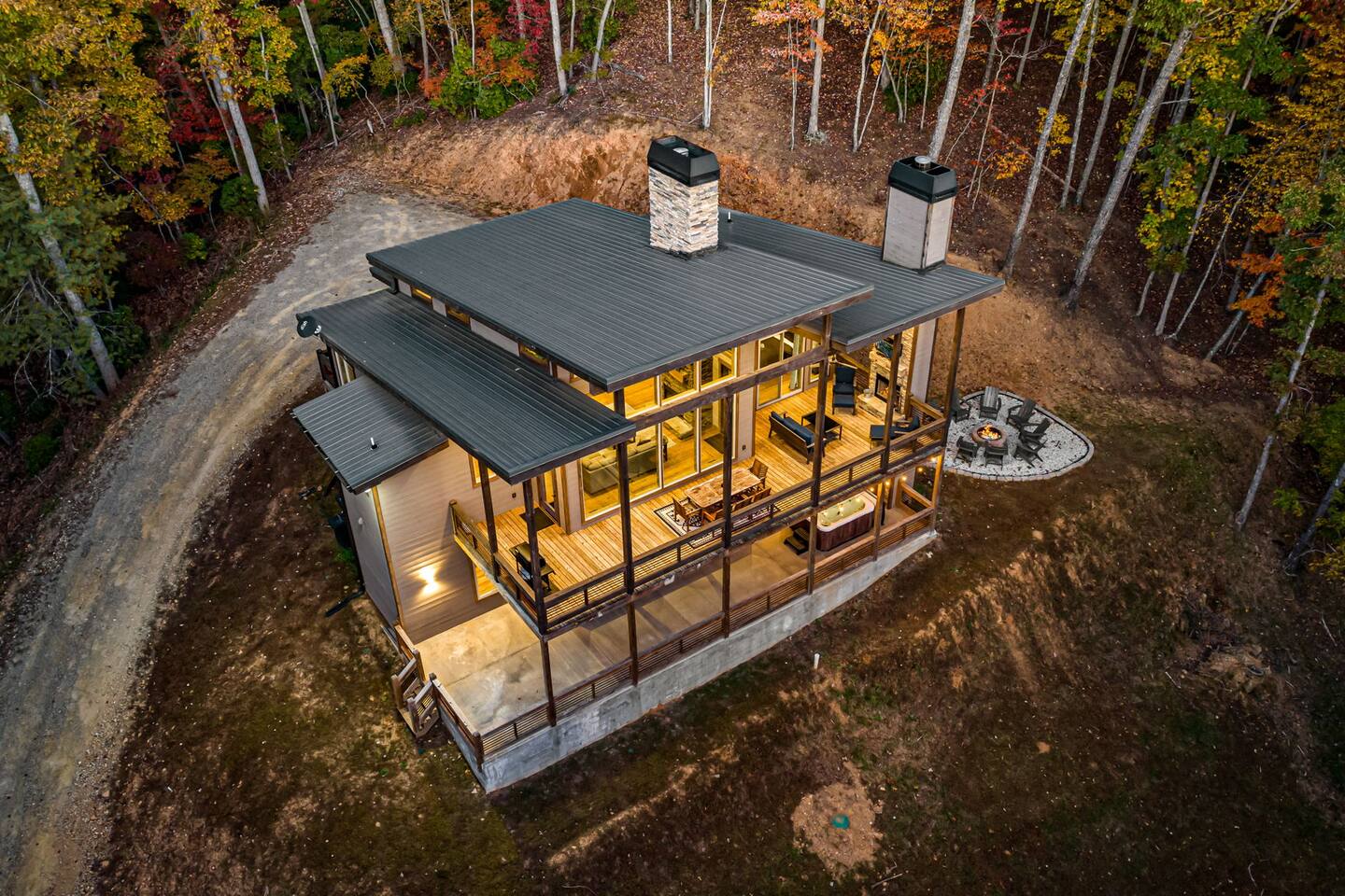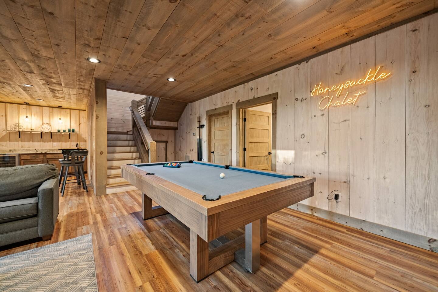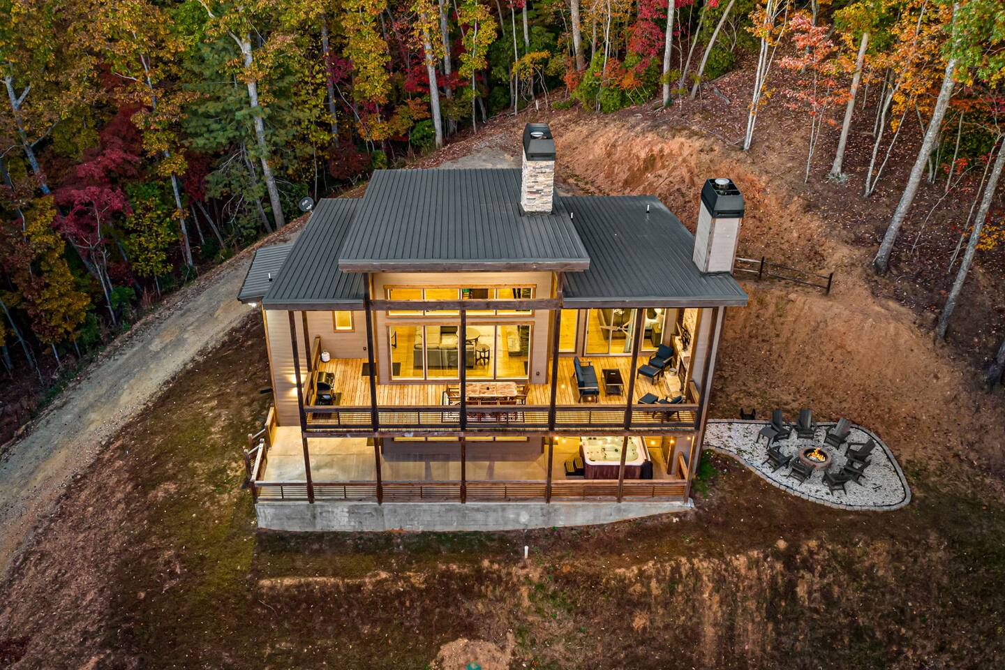 Features • 3 Bed/2.5 Bathroom Chalet - Sleeps 10 • Outdoor Hot Tub - Seats 7 • Game Room w/ Pool Table, Bar, and TV • 2 Gas Fireplaces, Outdoor Wood Burning Fireplace, Fire Pit • Large Deck for entertaining • Satellite TV and Cellular Wi-Fi • Parking for 3-4 vehicles • 15 Minutes from Blue Ridge Located in Morganton, Honeysuckle Chalet is approximately 15 minutes from Blue Ridge and Blairsville. A gravel road leads up a hill to the chalet where your wonderful vacation awaits. Available parking for up to 3-4 vehicles. This 3 bedroom, 2.5 bath chalet that sleeps 9 is 2 levels. There are a small set of stairs that lead up to the covered porch. As you enter your breath will be taken away by the amazing views from the main floor windows. On this level, you will find a fully equipped kitchen with quartz countertops, luxury Italian appliances, a large island just waiting to be used those big family meals. The open floor plan living area features large couch and a TV above the 20 ft. stone stacked gas fireplace. The room is finished off with a modern dinning table that can seat 6. Just off the living space you will find the powder room and laundry room featuring a full washer/dryer. The master bedroom is right off the main living space and includes a King bed with TV and features an attached bathroom. The bathroom features dual vanities and a gorgeously tiled shower with a rainfall head. The the glass sliding doors will lead you right into the outdoor entertainment area. As you descend into the lower level you will enter the game room. Here you will find the wet bar as well as several entertainment items including a pool table, TV, board games and cornhole. You will also find a pull out sofa that makes into a Queen sized bed. Off the game room you will find two additional bedrooms. The first includes a custom built bunk bed with sleep for 4 (all twins) and their own TV. The second is a Queen with a TV. There is a full bathroom right off the game room featuring dual vanities and a shower/tub combo. All tastefully decorated and ready for your enjoyment. Outside on the main level there is a large deck that offers several seating options, an outdoor table and chairs that seats six, as well as the relaxing wood burning fireplace with TV. Offering beautiful wooded views and partial mountain views any time of the year. On the lower level you will find the beautiful hot tub and several anorak chairs for full relaxation. If you are looking for the perfect place to gather with friends or family, minutes away from all of the area attractions, Honeysuckle Chalet would be your ideal vacation haven. Don't miss out --- book this modern, beautiful chalet today!