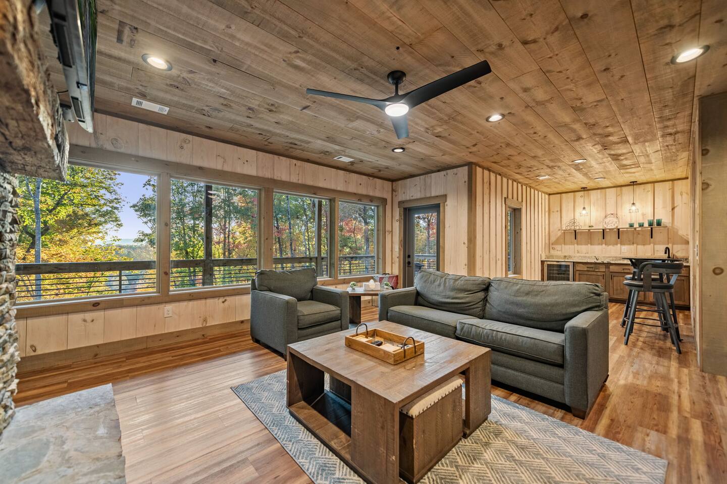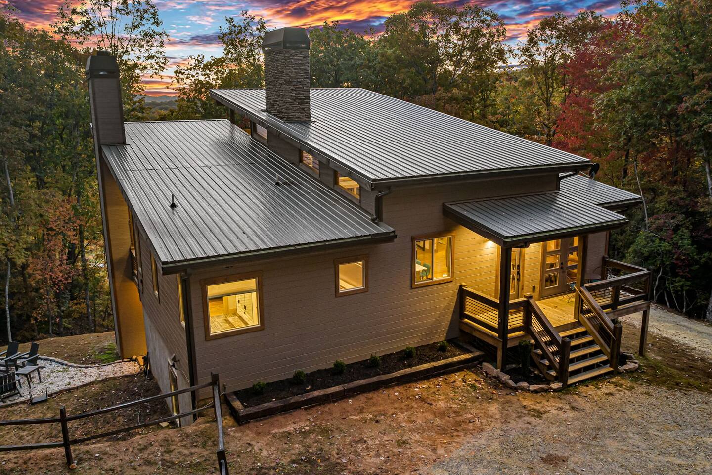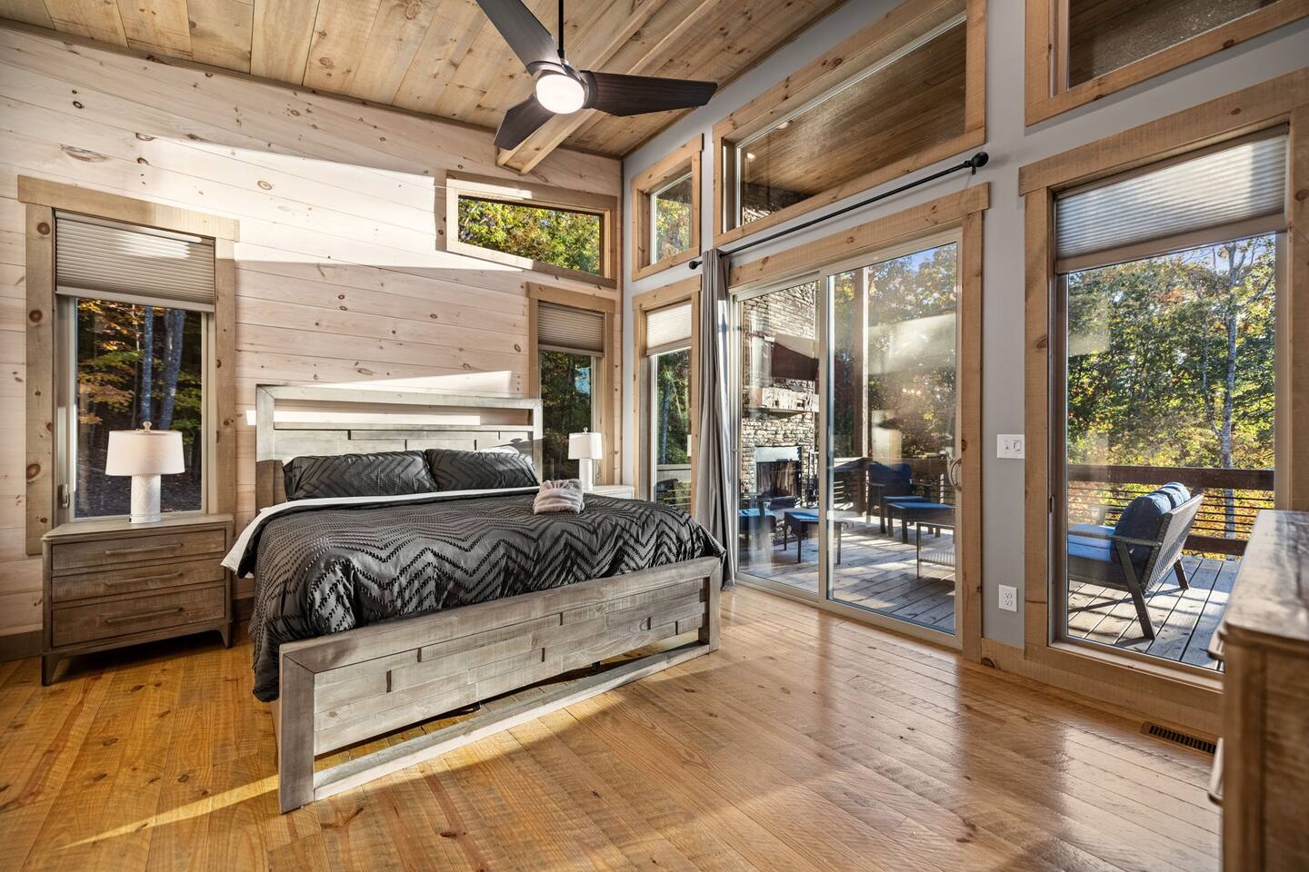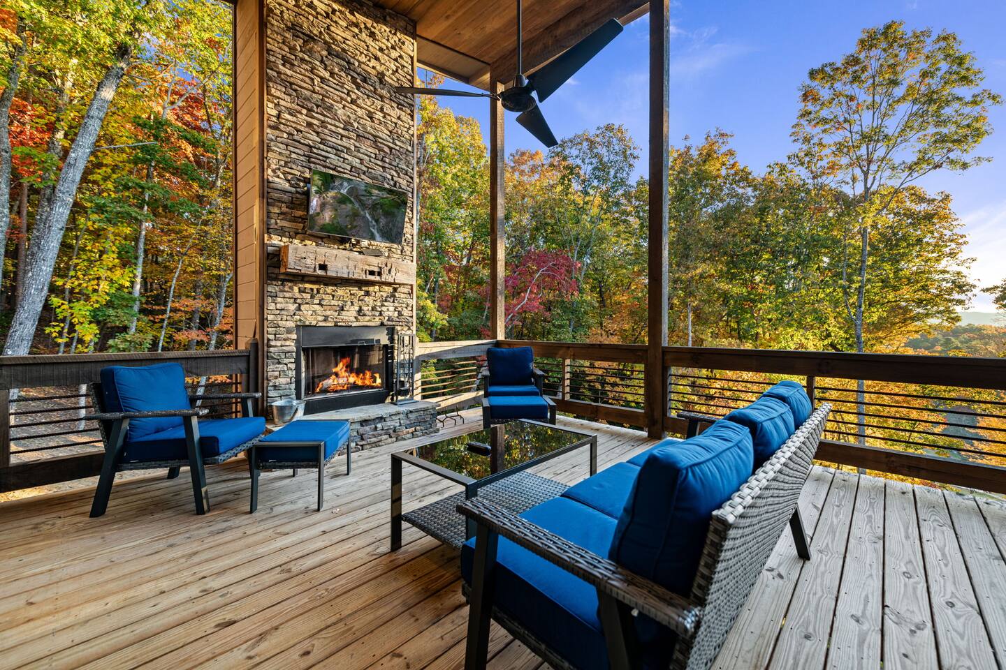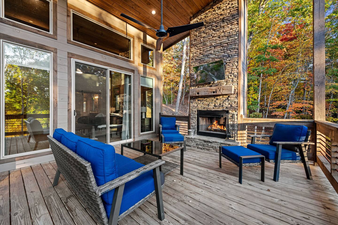 Features • 3 Bed/2.5 Bathroom Chalet - Sleeps 10 • Outdoor Hot Tub - Seats 7 • Game Room w/ Pool Table, Bar, and TV • 2 Gas Fireplaces, Outdoor Wood Burning Fireplace, Fire Pit • Large Deck for entertaining • Satellite TV and Cellular Wi-Fi • Parking for 3-4 vehicles • 15 Minutes from Blue Ridge Located in Morganton, Honeysuckle Chalet is approximately 15 minutes from Blue Ridge and Blairsville. A gravel road leads up a hill to the chalet where your wonderful vacation awaits. Available parking for up to 3-4 vehicles. This 3 bedroom, 2.5 bath chalet that sleeps 9 is 2 levels. There are a small set of stairs that lead up to the covered porch. As you enter your breath will be taken away by the amazing views from the main floor windows. On this level, you will find a fully equipped kitchen with quartz countertops, luxury Italian appliances, a large island just waiting to be used those big family meals. The open floor plan living area features large couch and a TV above the 20 ft. stone stacked gas fireplace. The room is finished off with a modern dinning table that can seat 6. Just off the living space you will find the powder room and laundry room featuring a full washer/dryer. The master bedroom is right off the main living space and includes a King bed with TV and features an attached bathroom. The bathroom features dual vanities and a gorgeously tiled shower with a rainfall head. The the glass sliding doors will lead you right into the outdoor entertainment area. As you descend into the lower level you will enter the game room. Here you will find the wet bar as well as several entertainment items including a pool table, TV, board games and cornhole. You will also find a pull out sofa that makes into a Queen sized bed. Off the game room you will find two additional bedrooms. The first includes a custom built bunk bed with sleep for 4 (all twins) and their own TV. The second is a Queen with a TV. There is a full bathroom right off the game room featuring dual vanities and a shower/tub combo. All tastefully decorated and ready for your enjoyment. Outside on the main level there is a large deck that offers several seating options, an outdoor table and chairs that seats six, as well as the relaxing wood burning fireplace with TV. Offering beautiful wooded views and partial mountain views any time of the year. On the lower level you will find the beautiful hot tub and several anorak chairs for full relaxation. If you are looking for the perfect place to gather with friends or family, minutes away from all of the area attractions, Honeysuckle Chalet would be your ideal vacation haven. Don't miss out --- book this modern, beautiful chalet today!