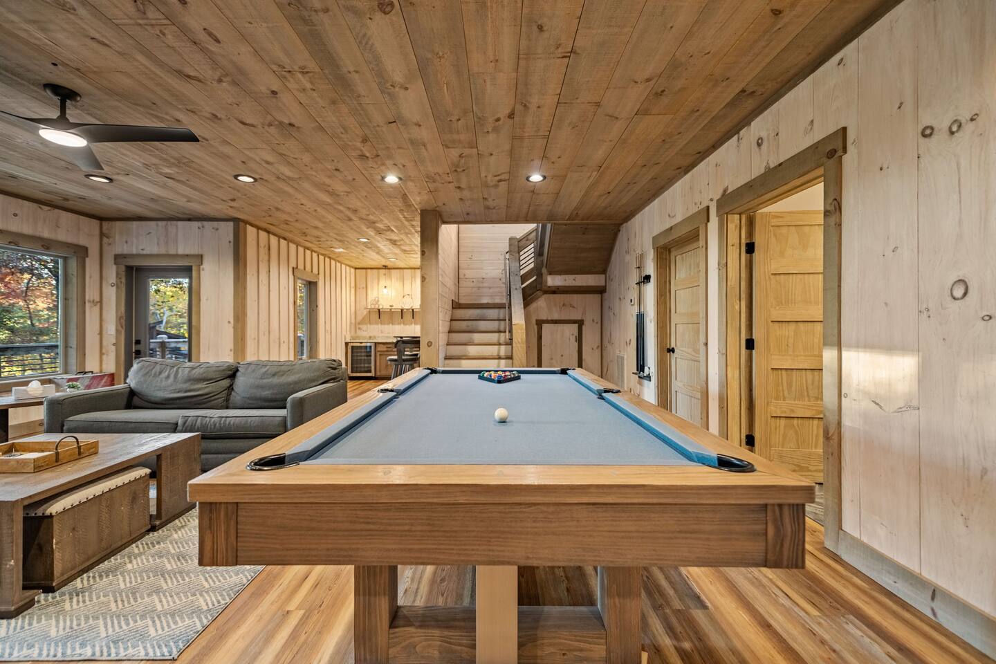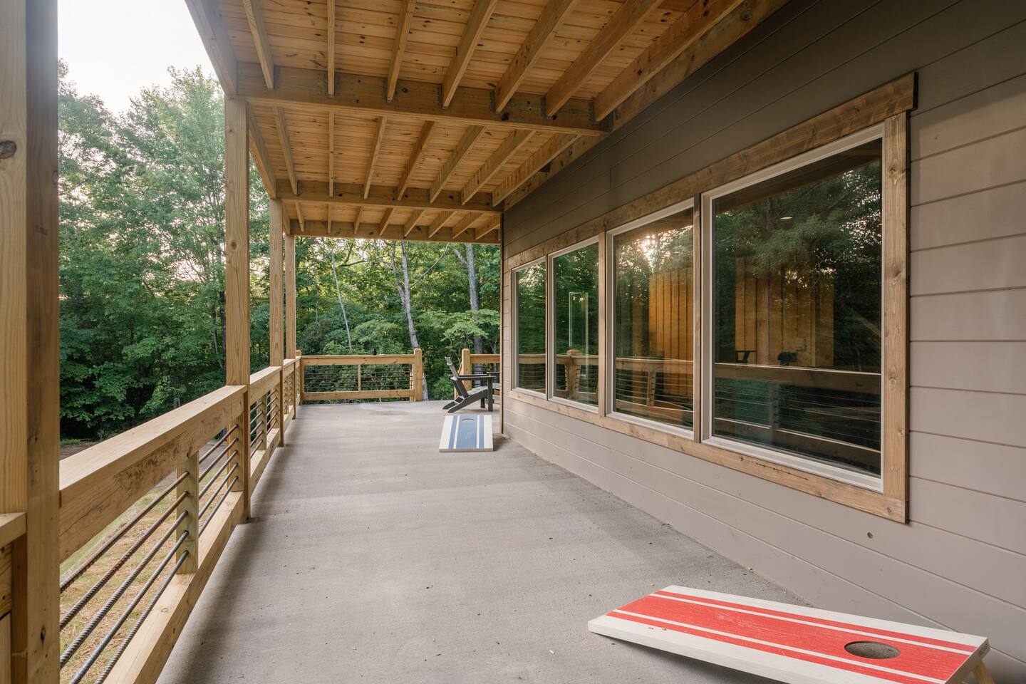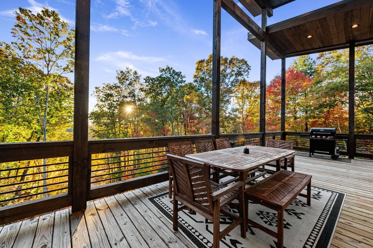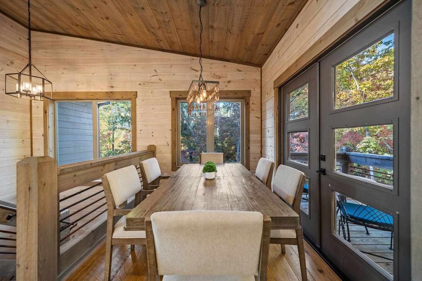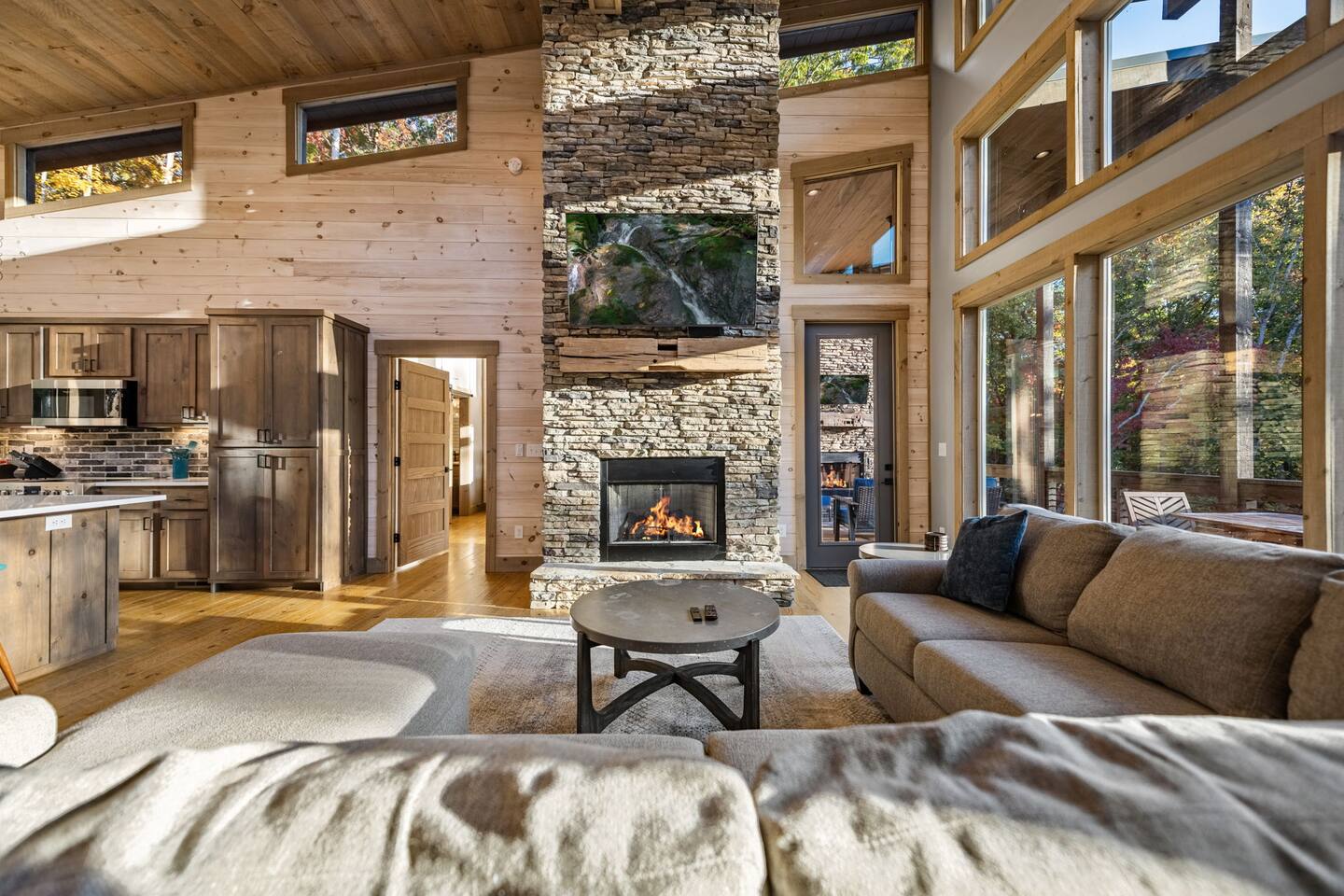 Features • 3 Bed/2.5 Bathroom Chalet - Sleeps 10 • Outdoor Hot Tub - Seats 7 • Game Room w/ Pool Table, Bar, and TV • 2 Gas Fireplaces, Outdoor Wood Burning Fireplace, Fire Pit • Large Deck for entertaining • Satellite TV and Cellular Wi-Fi • Parking for 3-4 vehicles • 15 Minutes from Blue Ridge Located in Morganton, Honeysuckle Chalet is approximately 15 minutes from Blue Ridge and Blairsville. A gravel road leads up a hill to the chalet where your wonderful vacation awaits. Available parking for up to 3-4 vehicles. This 3 bedroom, 2.5 bath chalet that sleeps 9 is 2 levels. There are a small set of stairs that lead up to the covered porch. As you enter your breath will be taken away by the amazing views from the main floor windows. On this level, you will find a fully equipped kitchen with quartz countertops, luxury Italian appliances, a large island just waiting to be used those big family meals. The open floor plan living area features large couch and a TV above the 20 ft. stone stacked gas fireplace. The room is finished off with a modern dinning table that can seat 6. Just off the living space you will find the powder room and laundry room featuring a full washer/dryer. The master bedroom is right off the main living space and includes a King bed with TV and features an attached bathroom. The bathroom features dual vanities and a gorgeously tiled shower with a rainfall head. The the glass sliding doors will lead you right into the outdoor entertainment area. As you descend into the lower level you will enter the game room. Here you will find the wet bar as well as several entertainment items including a pool table, TV, board games and cornhole. You will also find a pull out sofa that makes into a Queen sized bed. Off the game room you will find two additional bedrooms. The first includes a custom built bunk bed with sleep for 4 (all twins) and their own TV. The second is a Queen with a TV. There is a full bathroom right off the game room featuring dual vanities and a shower/tub combo. All tastefully decorated and ready for your enjoyment. Outside on the main level there is a large deck that offers several seating options, an outdoor table and chairs that seats six, as well as the relaxing wood burning fireplace with TV. Offering beautiful wooded views and partial mountain views any time of the year. On the lower level you will find the beautiful hot tub and several anorak chairs for full relaxation. If you are looking for the perfect place to gather with friends or family, minutes away from all of the area attractions, Honeysuckle Chalet would be your ideal vacation haven. Don't miss out --- book this modern, beautiful chalet today!