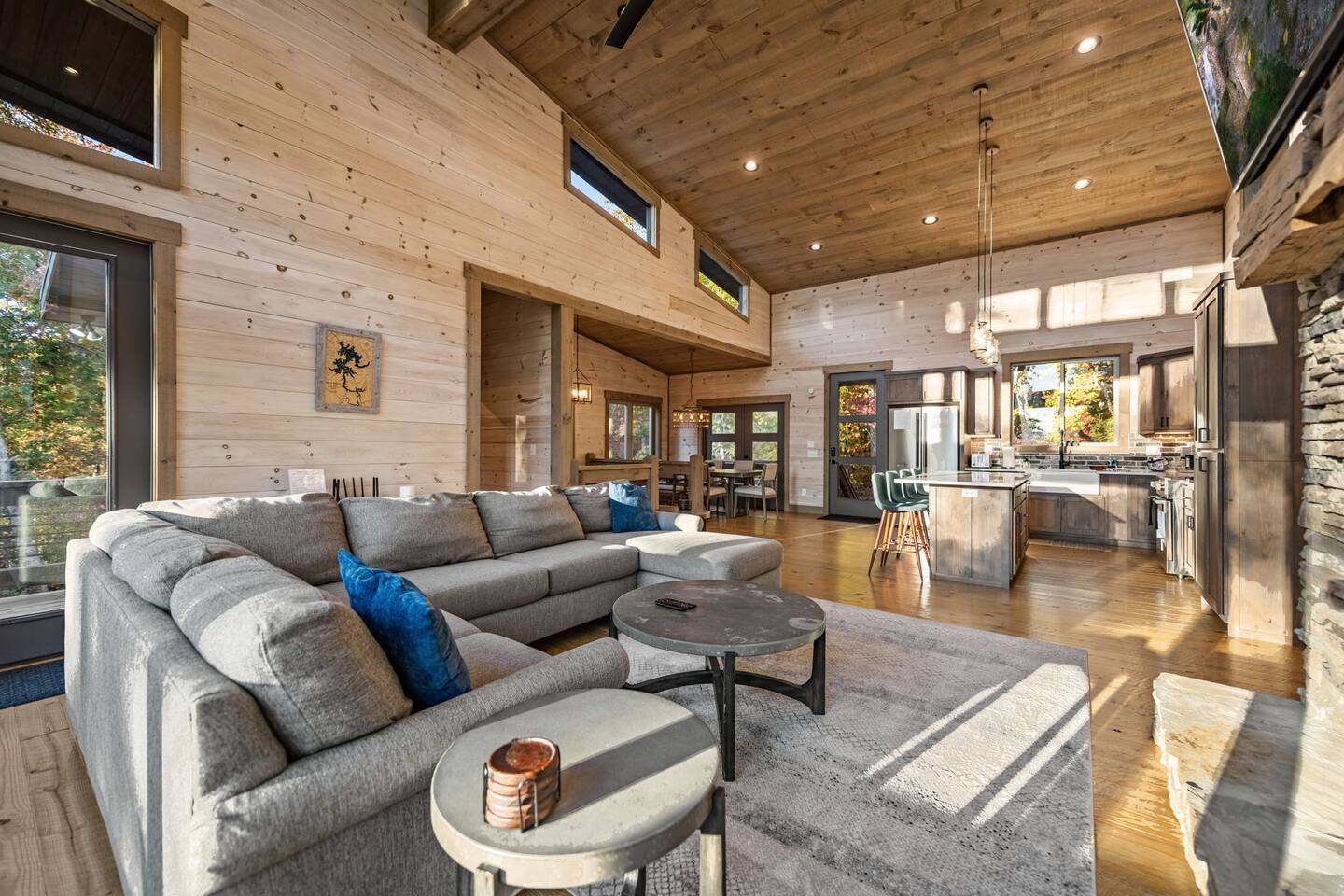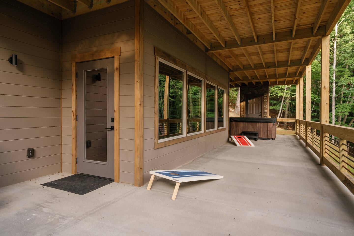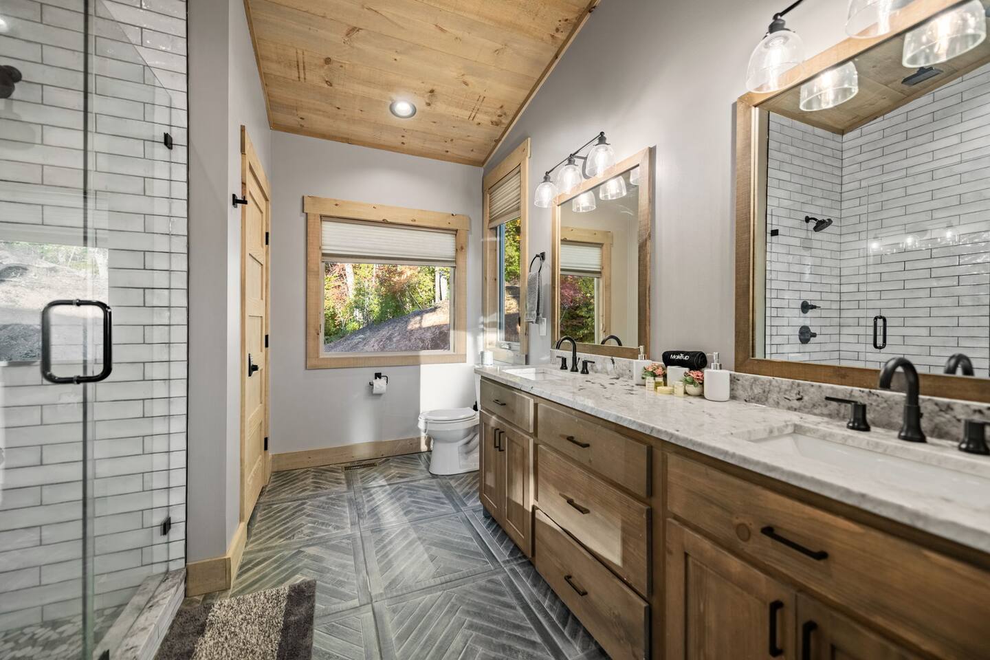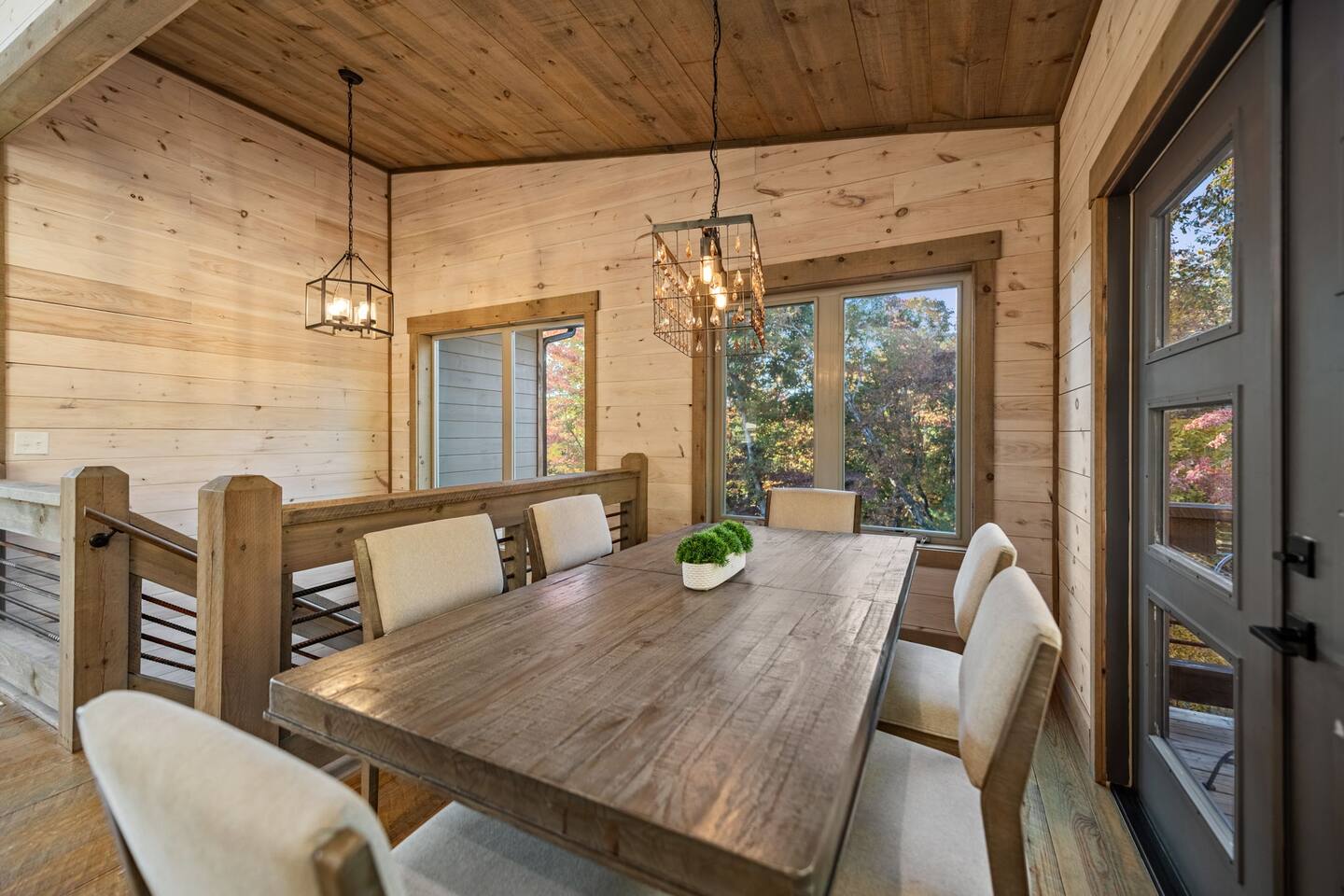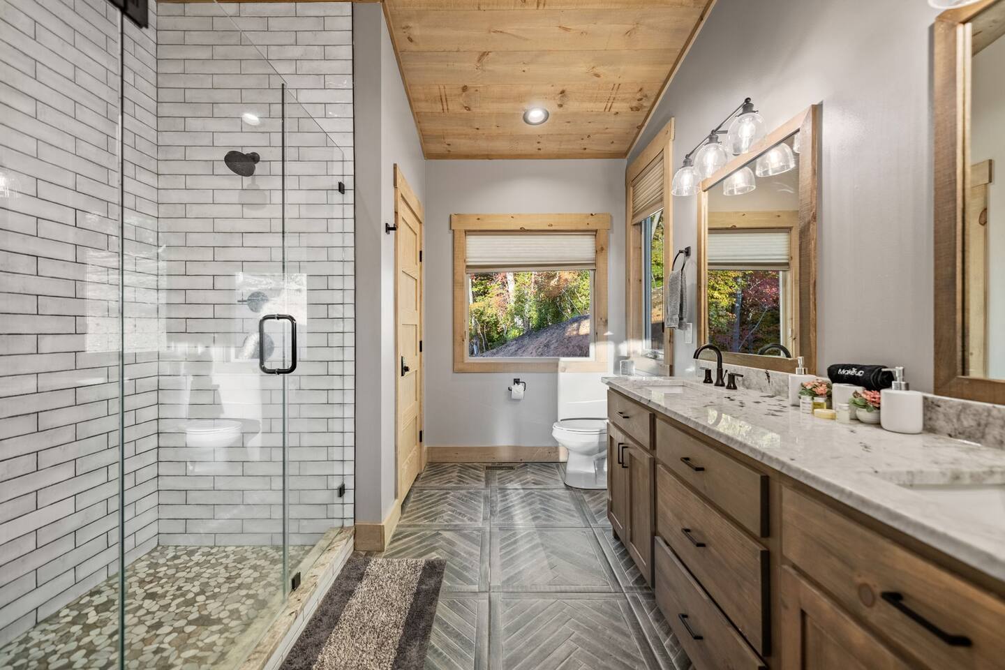 Features • 3 Bed/2.5 Bathroom Chalet - Sleeps 10 • Outdoor Hot Tub - Seats 7 • Game Room w/ Pool Table, Bar, and TV • 2 Gas Fireplaces, Outdoor Wood Burning Fireplace, Fire Pit • Large Deck for entertaining • Satellite TV and Cellular Wi-Fi • Parking for 3-4 vehicles • 15 Minutes from Blue Ridge Located in Morganton, Honeysuckle Chalet is approximately 15 minutes from Blue Ridge and Blairsville. A gravel road leads up a hill to the chalet where your wonderful vacation awaits. Available parking for up to 3-4 vehicles. This 3 bedroom, 2.5 bath chalet that sleeps 9 is 2 levels. There are a small set of stairs that lead up to the covered porch. As you enter your breath will be taken away by the amazing views from the main floor windows. On this level, you will find a fully equipped kitchen with quartz countertops, luxury Italian appliances, a large island just waiting to be used those big family meals. The open floor plan living area features large couch and a TV above the 20 ft. stone stacked gas fireplace. The room is finished off with a modern dinning table that can seat 6. Just off the living space you will find the powder room and laundry room featuring a full washer/dryer. The master bedroom is right off the main living space and includes a King bed with TV and features an attached bathroom. The bathroom features dual vanities and a gorgeously tiled shower with a rainfall head. The the glass sliding doors will lead you right into the outdoor entertainment area. As you descend into the lower level you will enter the game room. Here you will find the wet bar as well as several entertainment items including a pool table, TV, board games and cornhole. You will also find a pull out sofa that makes into a Queen sized bed. Off the game room you will find two additional bedrooms. The first includes a custom built bunk bed with sleep for 4 (all twins) and their own TV. The second is a Queen with a TV. There is a full bathroom right off the game room featuring dual vanities and a shower/tub combo. All tastefully decorated and ready for your enjoyment. Outside on the main level there is a large deck that offers several seating options, an outdoor table and chairs that seats six, as well as the relaxing wood burning fireplace with TV. Offering beautiful wooded views and partial mountain views any time of the year. On the lower level you will find the beautiful hot tub and several anorak chairs for full relaxation. If you are looking for the perfect place to gather with friends or family, minutes away from all of the area attractions, Honeysuckle Chalet would be your ideal vacation haven. Don't miss out --- book this modern, beautiful chalet today!