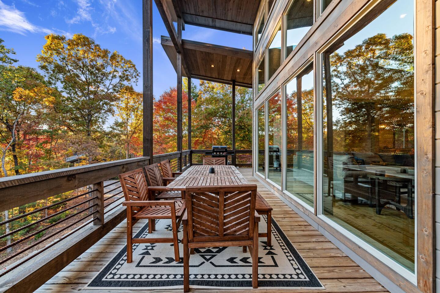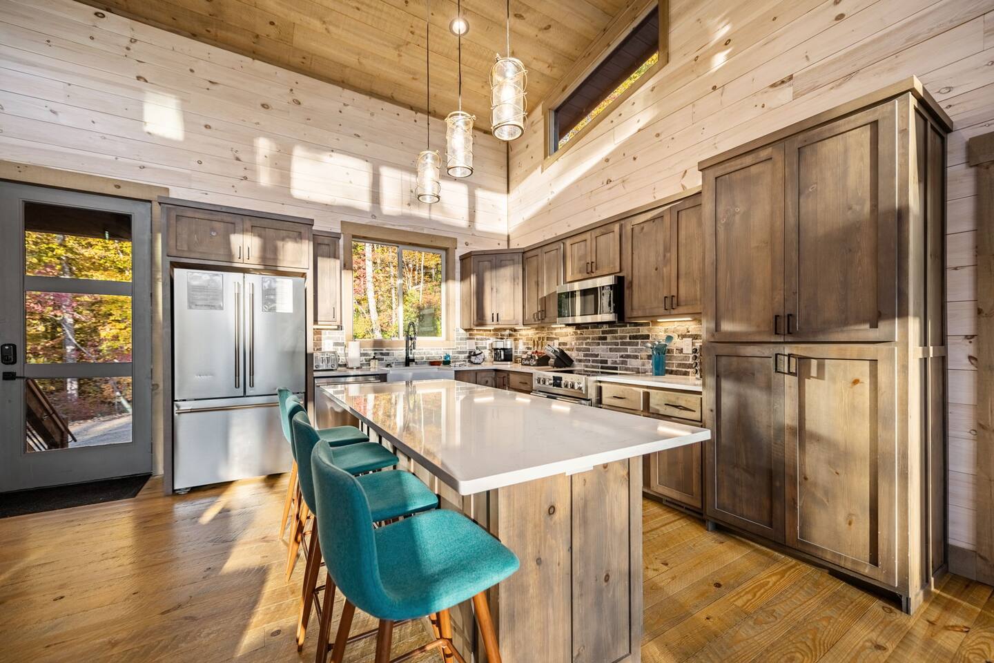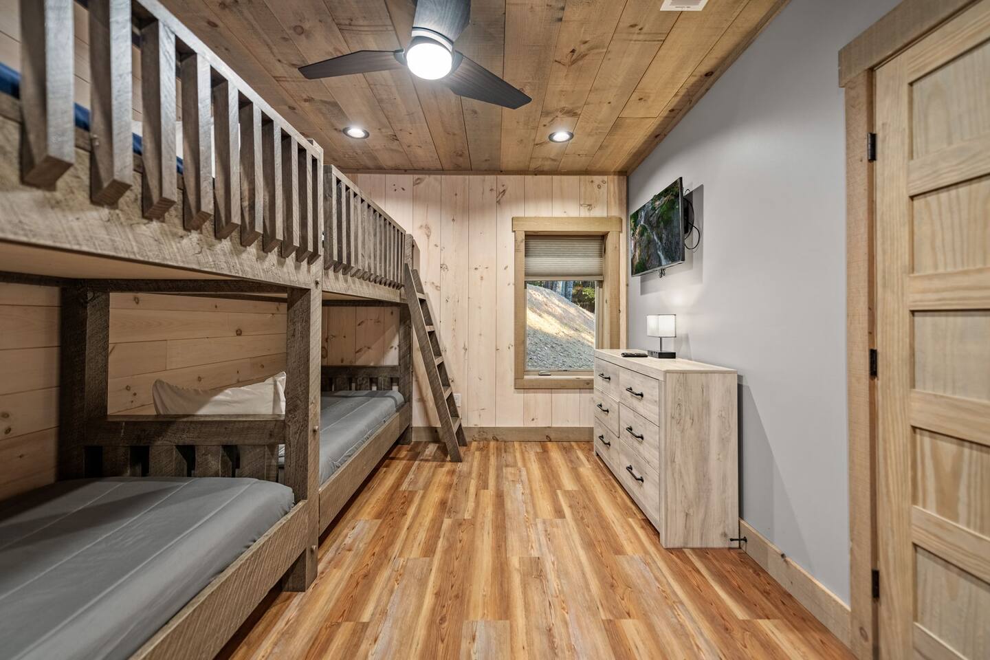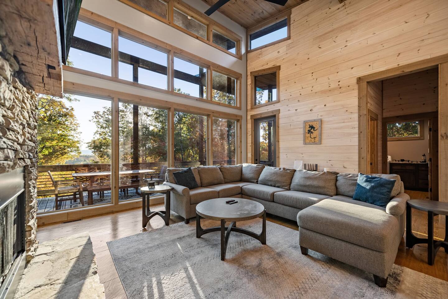 Features • 3 Bed/2.5 Bathroom Chalet - Sleeps 10 • Outdoor Hot Tub - Seats 7 • Game Room w/ Pool Table, Bar, and TV • 2 Gas Fireplaces, Outdoor Wood Burning Fireplace, Fire Pit • Large Deck for entertaining • Satellite TV and Cellular Wi-Fi • Parking for 3-4 vehicles • 15 Minutes from Blue Ridge Located in Morganton, Honeysuckle Chalet is approximately 15 minutes from Blue Ridge and Blairsville. A gravel road leads up a hill to the chalet where your wonderful vacation awaits. Available parking for up to 3-4 vehicles. This 3 bedroom, 2.5 bath chalet that sleeps 9 is 2 levels. There are a small set of stairs that lead up to the covered porch. As you enter your breath will be taken away by the amazing views from the main floor windows. On this level, you will find a fully equipped kitchen with quartz countertops, luxury Italian appliances, a large island just waiting to be used those big family meals. The open floor plan living area features large couch and a TV above the 20 ft. stone stacked gas fireplace. The room is finished off with a modern dinning table that can seat 6. Just off the living space you will find the powder room and laundry room featuring a full washer/dryer. The master bedroom is right off the main living space and includes a King bed with TV and features an attached bathroom. The bathroom features dual vanities and a gorgeously tiled shower with a rainfall head. The the glass sliding doors will lead you right into the outdoor entertainment area. As you descend into the lower level you will enter the game room. Here you will find the wet bar as well as several entertainment items including a pool table, TV, board games and cornhole. You will also find a pull out sofa that makes into a Queen sized bed. Off the game room you will find two additional bedrooms. The first includes a custom built bunk bed with sleep for 4 (all twins) and their own TV. The second is a Queen with a TV. There is a full bathroom right off the game room featuring dual vanities and a shower/tub combo. All tastefully decorated and ready for your enjoyment. Outside on the main level there is a large deck that offers several seating options, an outdoor table and chairs that seats six, as well as the relaxing wood burning fireplace with TV. Offering beautiful wooded views and partial mountain views any time of the year. On the lower level you will find the beautiful hot tub and several anorak chairs for full relaxation. If you are looking for the perfect place to gather with friends or family, minutes away from all of the area attractions, Honeysuckle Chalet would be your ideal vacation haven. Don't miss out --- book this modern, beautiful chalet today!