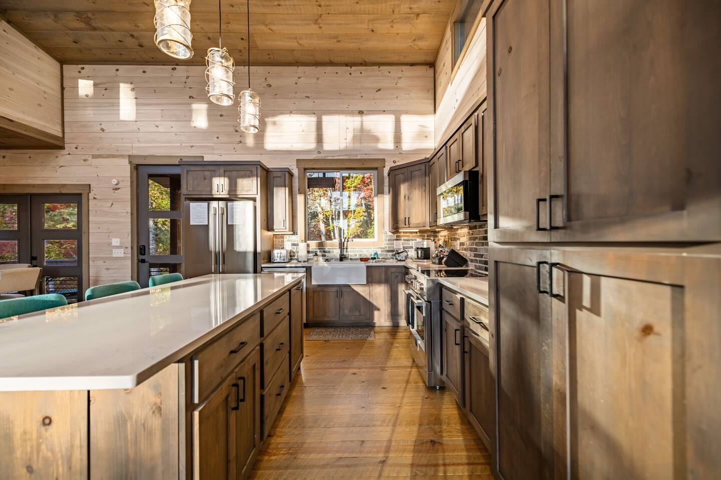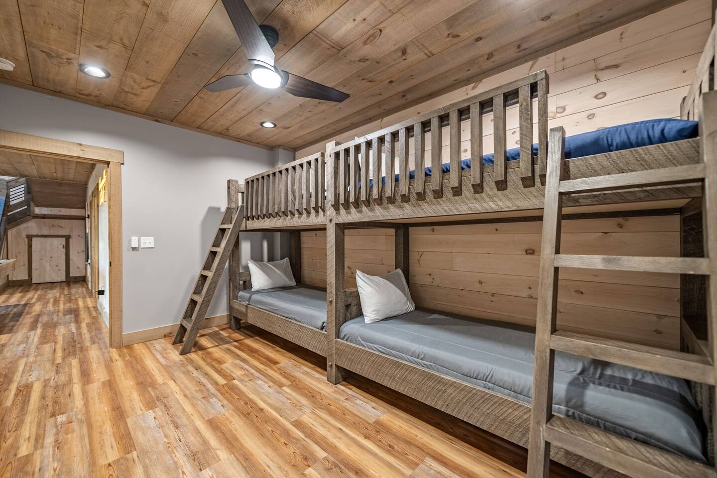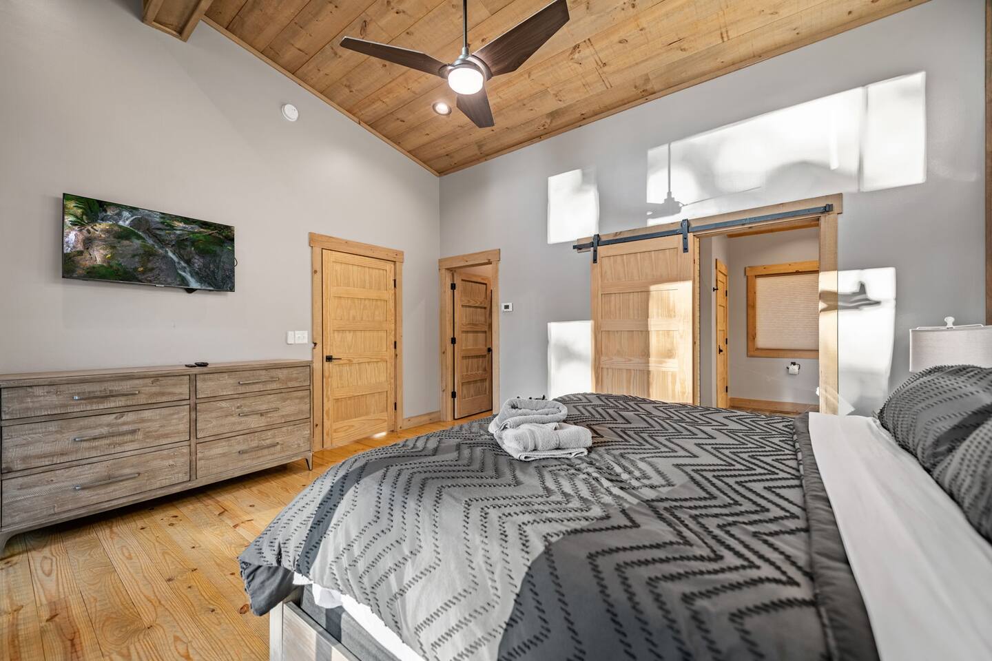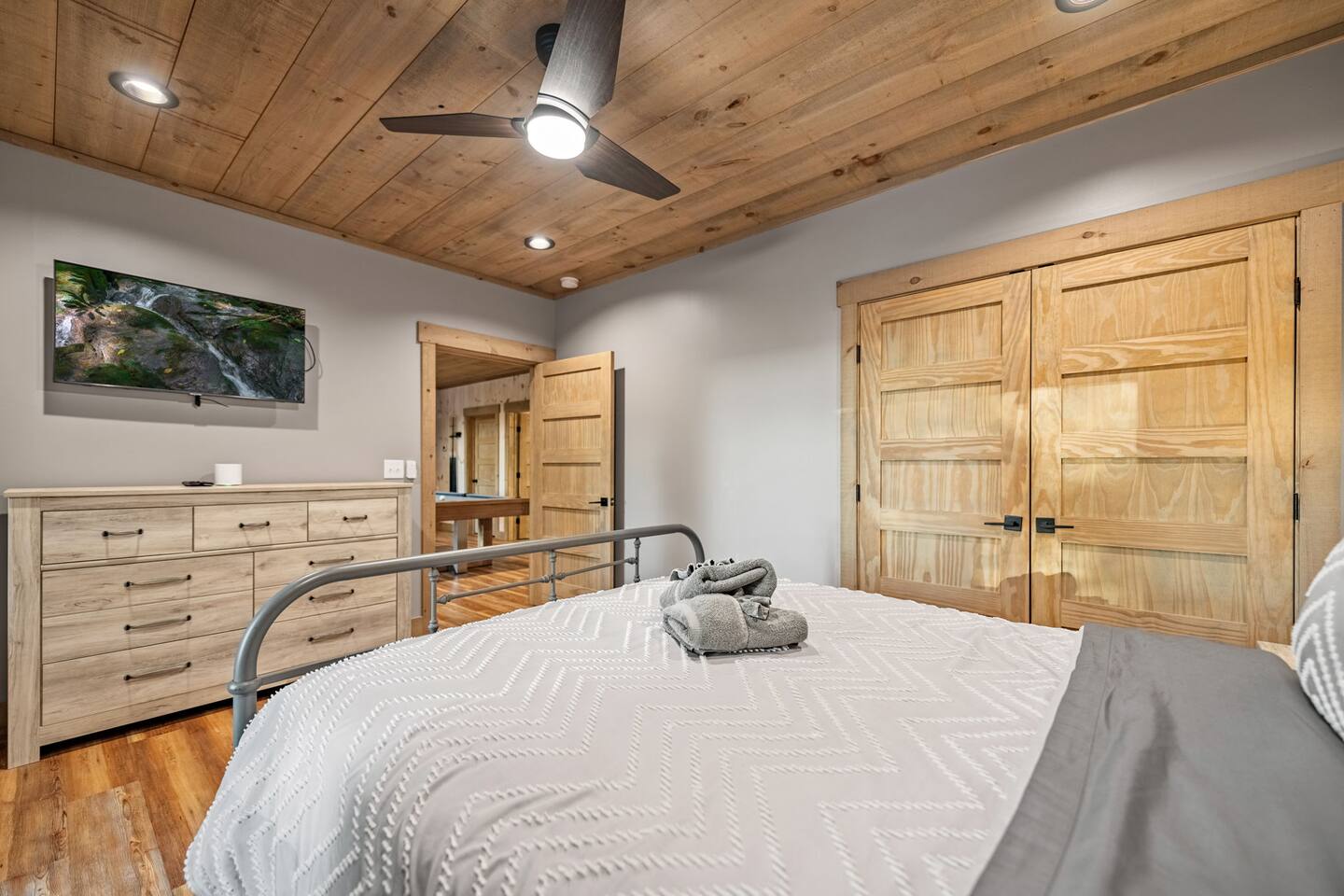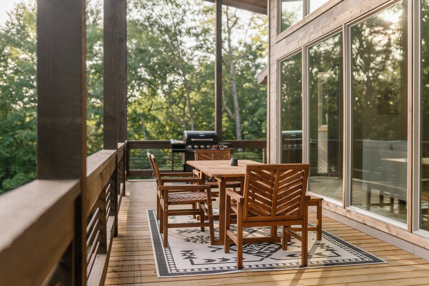 Features • 3 Bed/2.5 Bathroom Chalet - Sleeps 10 • Outdoor Hot Tub - Seats 7 • Game Room w/ Pool Table, Bar, and TV • 2 Gas Fireplaces, Outdoor Wood Burning Fireplace, Fire Pit • Large Deck for entertaining • Satellite TV and Cellular Wi-Fi • Parking for 3-4 vehicles • 15 Minutes from Blue Ridge Located in Morganton, Honeysuckle Chalet is approximately 15 minutes from Blue Ridge and Blairsville. A gravel road leads up a hill to the chalet where your wonderful vacation awaits. Available parking for up to 3-4 vehicles. This 3 bedroom, 2.5 bath chalet that sleeps 9 is 2 levels. There are a small set of stairs that lead up to the covered porch. As you enter your breath will be taken away by the amazing views from the main floor windows. On this level, you will find a fully equipped kitchen with quartz countertops, luxury Italian appliances, a large island just waiting to be used those big family meals. The open floor plan living area features large couch and a TV above the 20 ft. stone stacked gas fireplace. The room is finished off with a modern dinning table that can seat 6. Just off the living space you will find the powder room and laundry room featuring a full washer/dryer. The master bedroom is right off the main living space and includes a King bed with TV and features an attached bathroom. The bathroom features dual vanities and a gorgeously tiled shower with a rainfall head. The the glass sliding doors will lead you right into the outdoor entertainment area. As you descend into the lower level you will enter the game room. Here you will find the wet bar as well as several entertainment items including a pool table, TV, board games and cornhole. You will also find a pull out sofa that makes into a Queen sized bed. Off the game room you will find two additional bedrooms. The first includes a custom built bunk bed with sleep for 4 (all twins) and their own TV. The second is a Queen with a TV. There is a full bathroom right off the game room featuring dual vanities and a shower/tub combo. All tastefully decorated and ready for your enjoyment. Outside on the main level there is a large deck that offers several seating options, an outdoor table and chairs that seats six, as well as the relaxing wood burning fireplace with TV. Offering beautiful wooded views and partial mountain views any time of the year. On the lower level you will find the beautiful hot tub and several anorak chairs for full relaxation. If you are looking for the perfect place to gather with friends or family, minutes away from all of the area attractions, Honeysuckle Chalet would be your ideal vacation haven. Don't miss out --- book this modern, beautiful chalet today!