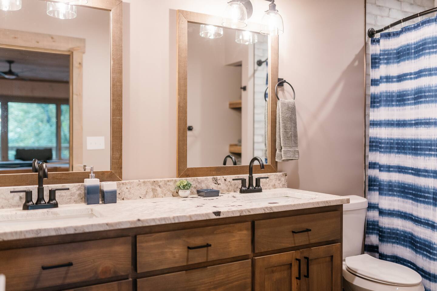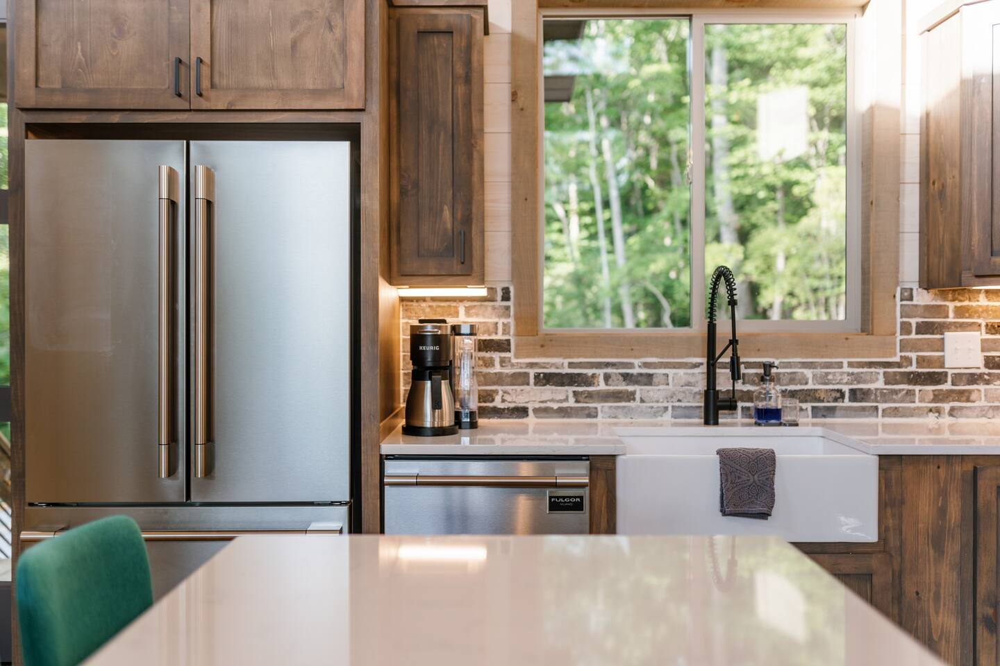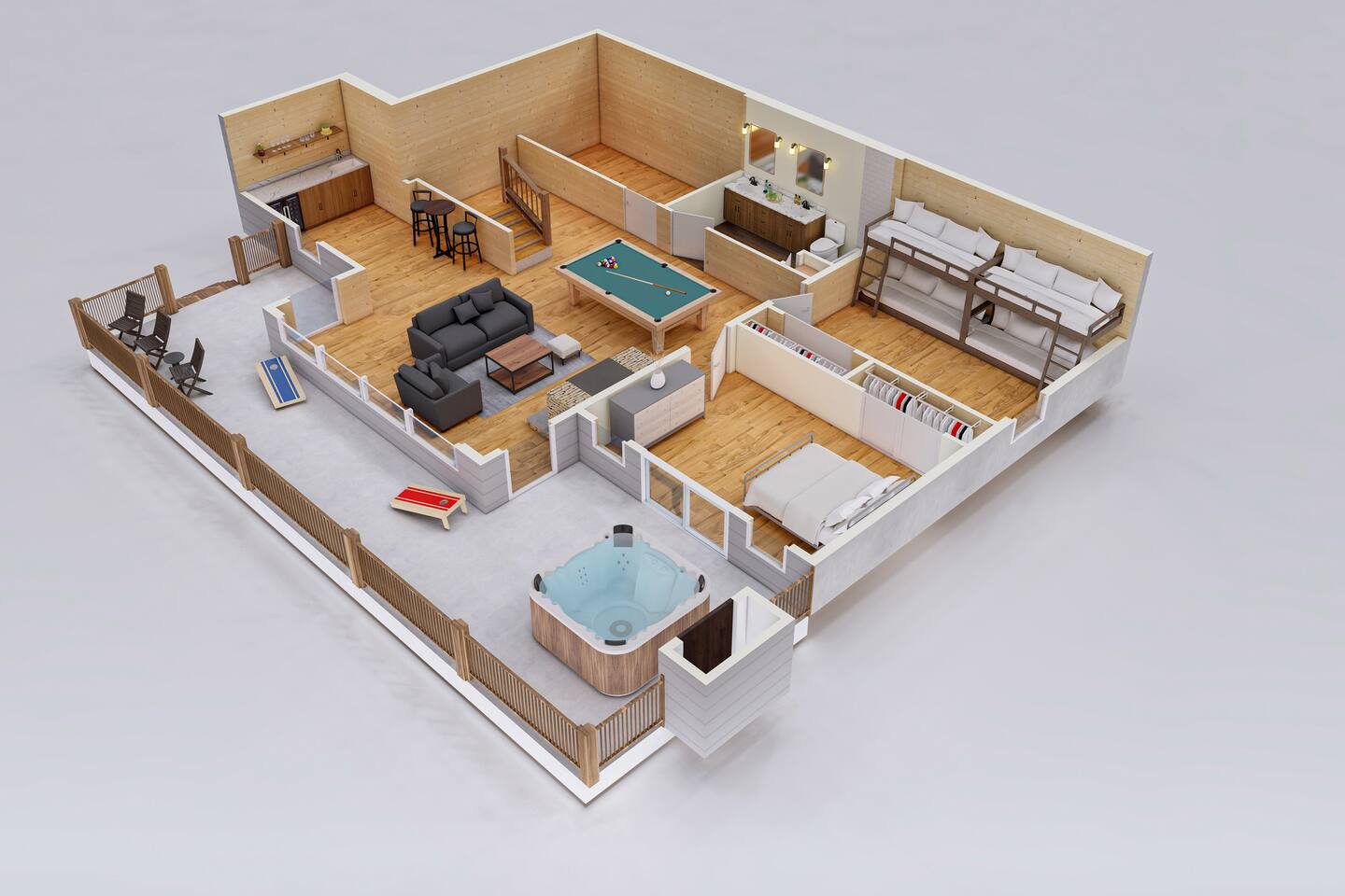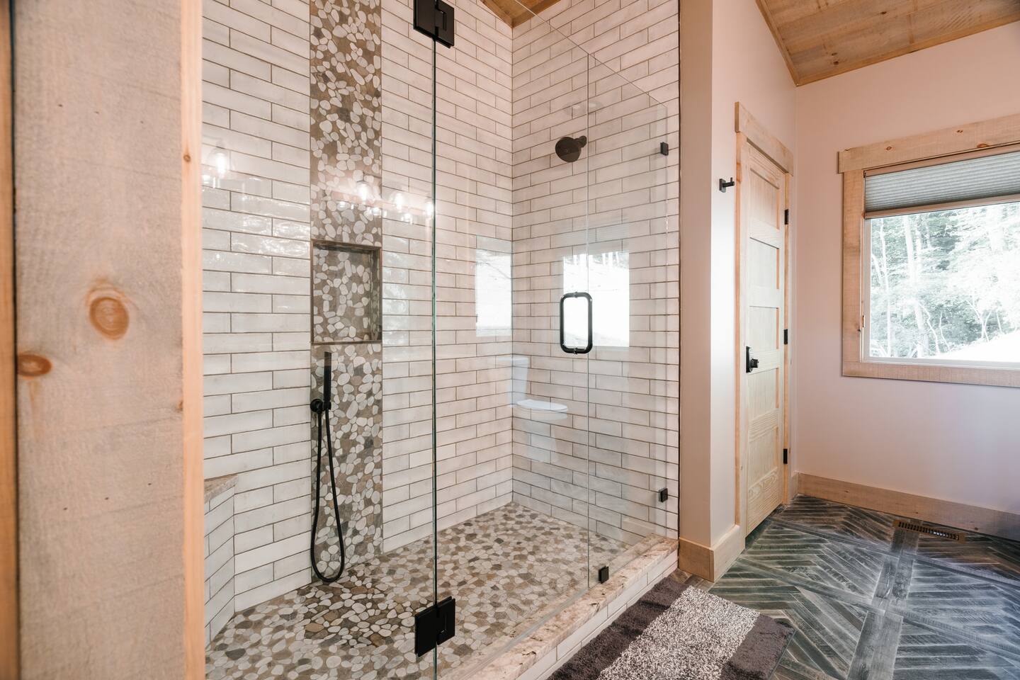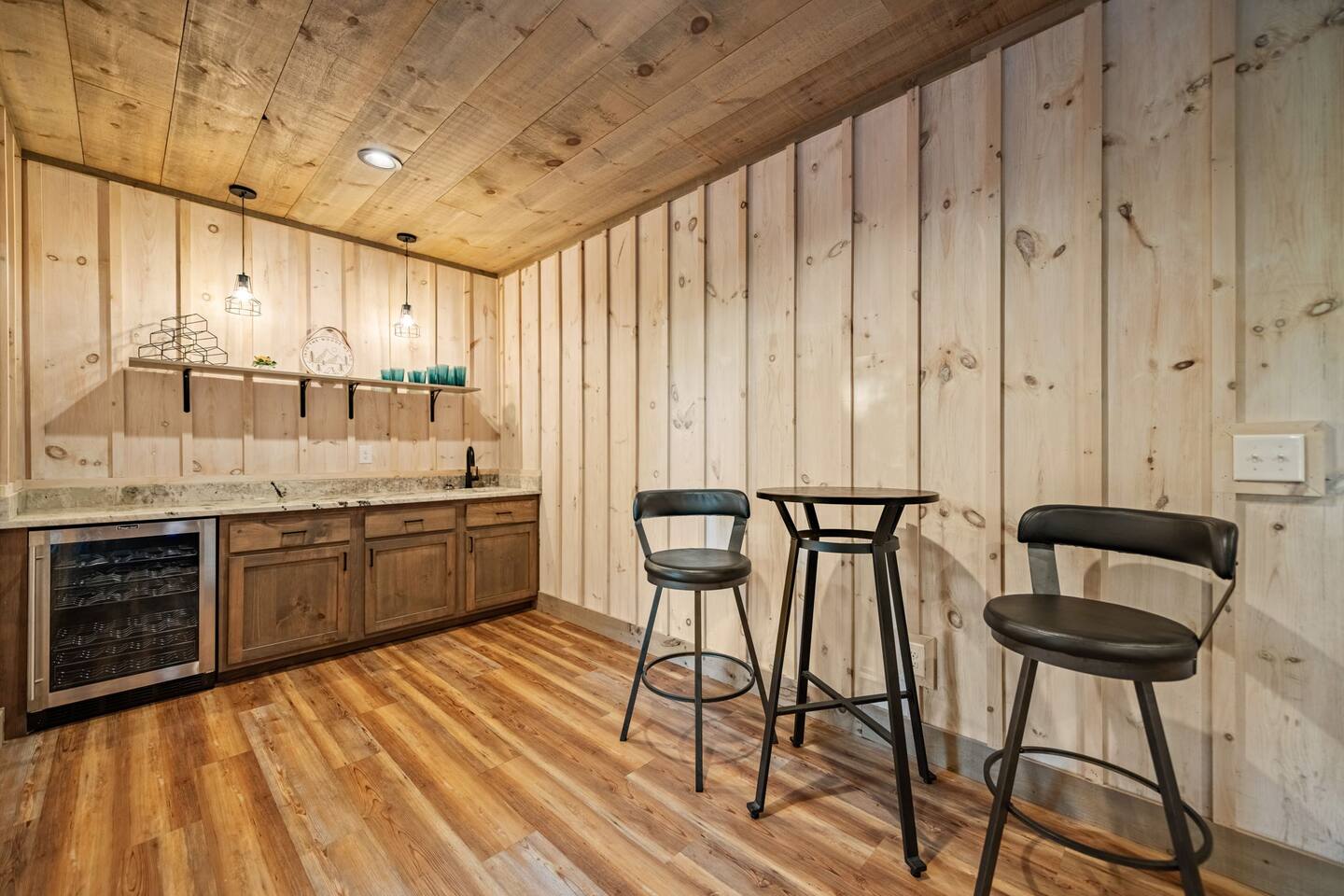 Features • 3 Bed/2.5 Bathroom Chalet - Sleeps 10 • Outdoor Hot Tub - Seats 7 • Game Room w/ Pool Table, Bar, and TV • 2 Gas Fireplaces, Outdoor Wood Burning Fireplace, Fire Pit • Large Deck for entertaining • Satellite TV and Cellular Wi-Fi • Parking for 3-4 vehicles • 15 Minutes from Blue Ridge Located in Morganton, Honeysuckle Chalet is approximately 15 minutes from Blue Ridge and Blairsville. A gravel road leads up a hill to the chalet where your wonderful vacation awaits. Available parking for up to 3-4 vehicles. This 3 bedroom, 2.5 bath chalet that sleeps 9 is 2 levels. There are a small set of stairs that lead up to the covered porch. As you enter your breath will be taken away by the amazing views from the main floor windows. On this level, you will find a fully equipped kitchen with quartz countertops, luxury Italian appliances, a large island just waiting to be used those big family meals. The open floor plan living area features large couch and a TV above the 20 ft. stone stacked gas fireplace. The room is finished off with a modern dinning table that can seat 6. Just off the living space you will find the powder room and laundry room featuring a full washer/dryer. The master bedroom is right off the main living space and includes a King bed with TV and features an attached bathroom. The bathroom features dual vanities and a gorgeously tiled shower with a rainfall head. The the glass sliding doors will lead you right into the outdoor entertainment area. As you descend into the lower level you will enter the game room. Here you will find the wet bar as well as several entertainment items including a pool table, TV, board games and cornhole. You will also find a pull out sofa that makes into a Queen sized bed. Off the game room you will find two additional bedrooms. The first includes a custom built bunk bed with sleep for 4 (all twins) and their own TV. The second is a Queen with a TV. There is a full bathroom right off the game room featuring dual vanities and a shower/tub combo. All tastefully decorated and ready for your enjoyment. Outside on the main level there is a large deck that offers several seating options, an outdoor table and chairs that seats six, as well as the relaxing wood burning fireplace with TV. Offering beautiful wooded views and partial mountain views any time of the year. On the lower level you will find the beautiful hot tub and several anorak chairs for full relaxation. If you are looking for the perfect place to gather with friends or family, minutes away from all of the area attractions, Honeysuckle Chalet would be your ideal vacation haven. Don't miss out --- book this modern, beautiful chalet today!