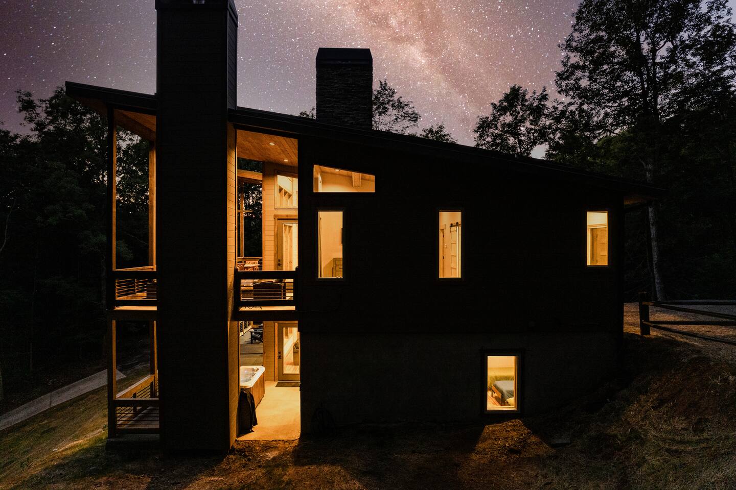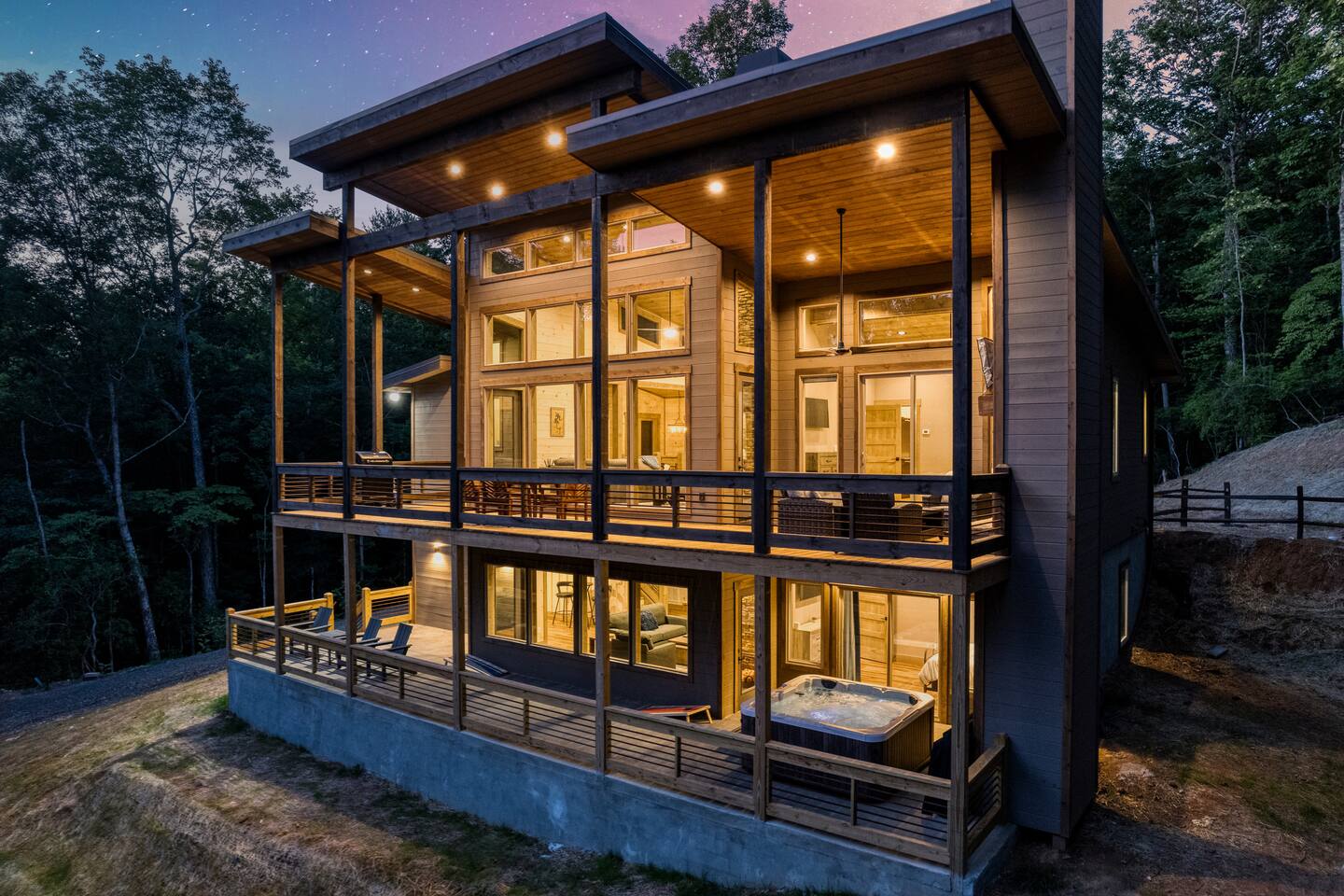 Brand new modern chalet just minutes from Blue Ridge. This 3-bedroom chalet offers 2 full-size bathrooms, a half bath and room for 10, along with a convenient location about 10 miles (15 min) from downtown Blue Ridge. That means easy access to all the wonderful attractions and splendor of Blue Ridge while enjoying the privacy and seclusion of Morganton. Featuring Wi-Fi, Hot Tub, Cable TV and a deck to enjoy all those wonderful spring days with a fireplace to warm up during those winter months.