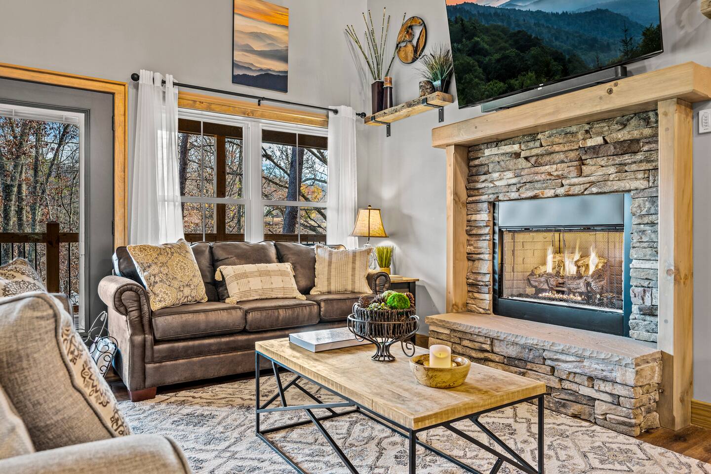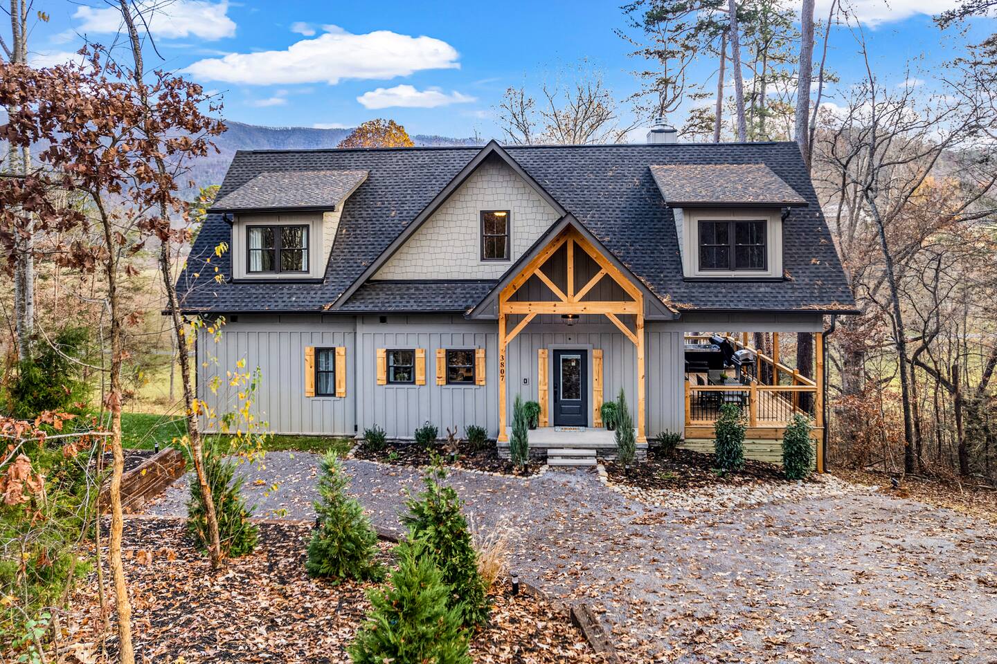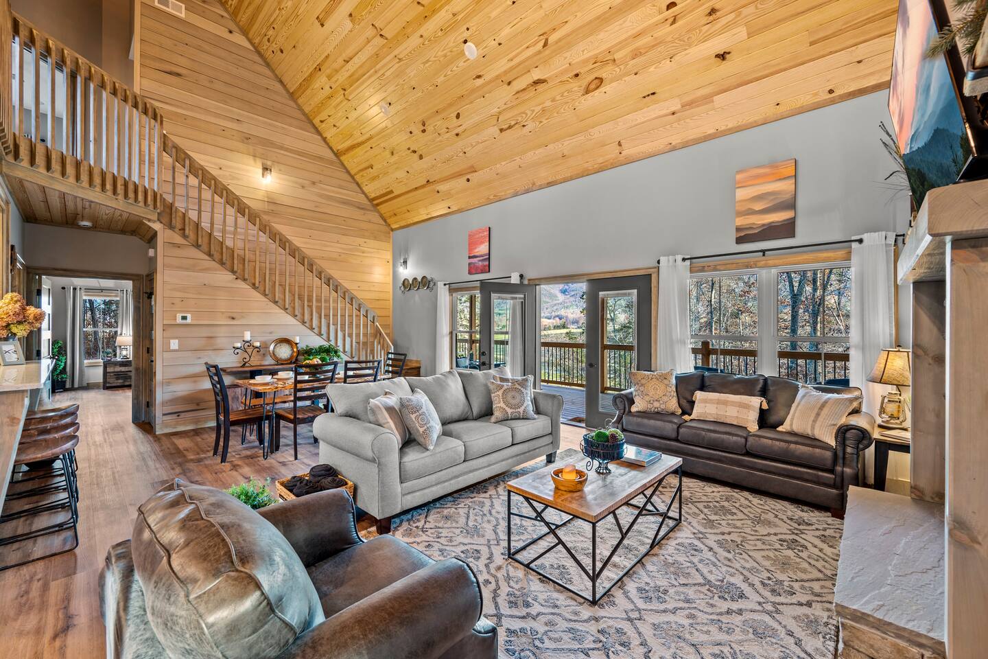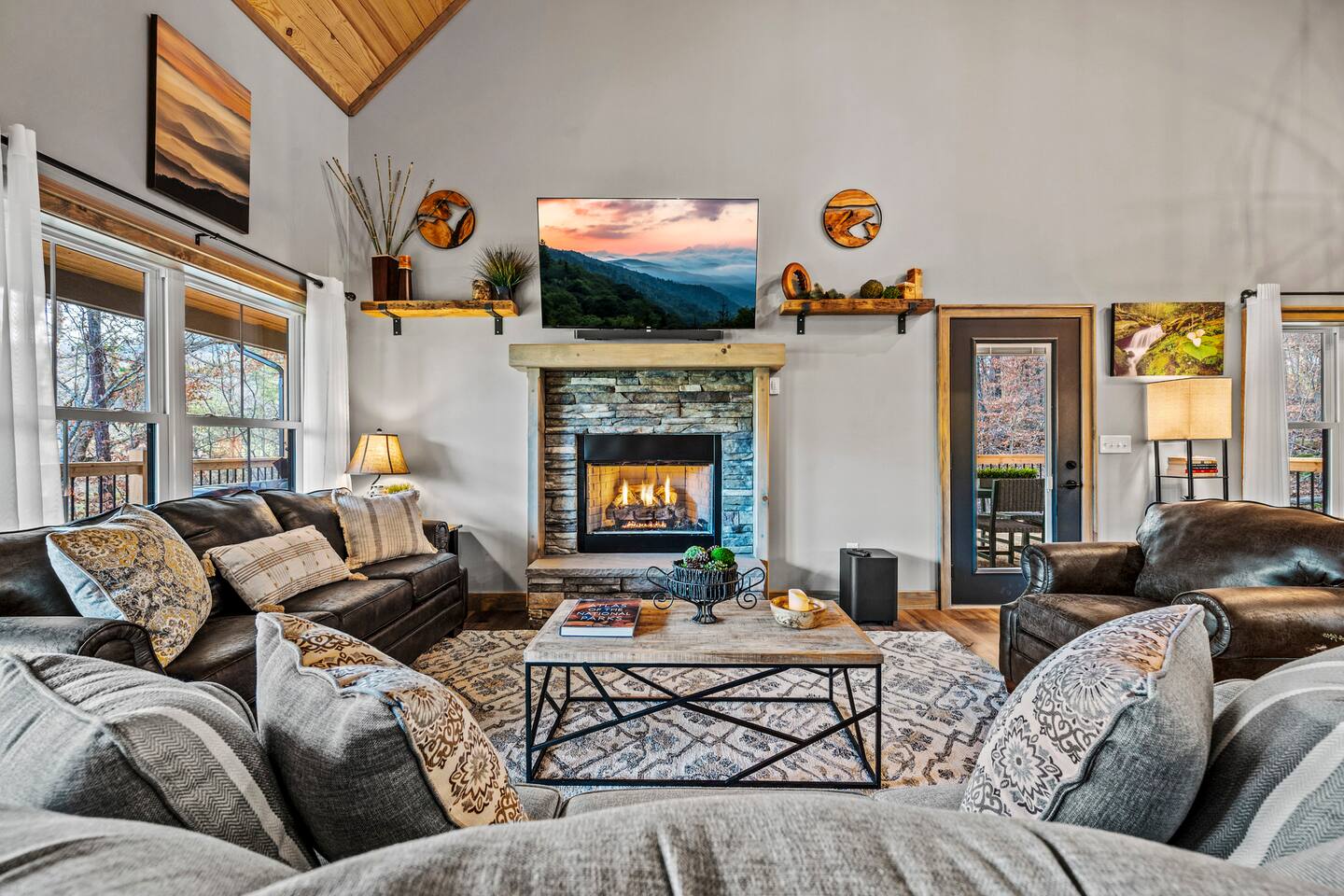 🌄 MYTHS OF THE MOUNTAIN | Wears Valley Retreat 🌄 ⭐ Featured Highlights • 3 Bedroom - Sleeps 8 • Panoramic mountain & valley views from nearly 1,000 sq ft of deck space • Easy paved access with LEVEL parking for up to 4 vehicles • Luxury hot tub with Bluetooth speakers & waterfall jets • Game loft with foosball + 60-game retro arcade • Community Pool Access (≈10 minutes away) • Gas fireplace, fire pit table & outdoor wood-burning fireplace • Prime location: 5 miles to the Smokies, minutes to Cades Cove • Starlink high-speed internet for remote work Peaceful, private setting with year-round accessibility Nestled in the heart of scenic Wears Valley, Myths of the Mountain offers a peaceful escape from everyday life while keeping you close to the best of the Smoky Mountains. Surrounded by sweeping views and quiet countryside, this thoughtfully designed cabin blends luxury, comfort, and convenience—making it a place guests love to return to year after year. Getting here is refreshingly easy. Paved roads lead directly to the cabin, where level parking for up to four vehicles eliminates the stress of steep mountain driveways. As you arrive, you’re greeted by stunning views of Cove Mountain, setting the tone for a relaxing stay from the moment you pull in. Inside, natural light fills the open living space through oversized picture windows that frame the mountains like living artwork. Comfortable leather and fabric seating invites you to relax by the gas fireplace, while the 65” 4K Roku TV paired with a JBL soundbar and subwoofer creates a cinematic experience for movie nights. The walls are adorned with striking canvas photography by National Geographic photographer Bill Lea, adding a unique local touch to the space. The gourmet kitchen flows seamlessly into the living and dining areas, making it perfect for gathering. It’s fully equipped with Calphalon cookware, a generous selection of small appliances, and thoughtful pantry staples to get you started. Whether you’re enjoying a quick breakfast at the bar, a family dinner at the dining table, or preparing a holiday meal with the oversized All-Clad turkey roaster, everything you need is right at hand. The main-level king suite feels like a private spa retreat. This spacious bedroom features French doors that open onto the deck, allowing you to wake up to panoramic valley views. The en-suite bathroom includes a double vanity, walk-in shower, and a freestanding soaking tub—perfect for unwinding after a day of hiking or sightseeing. Upstairs, the queen bedroom offers a quiet and comfortable space with blackout curtains, mountain views, and private access to a shared hall bathroom with a double vanity and tub/shower combo. The twin room is ideal for kids or extra guests, featuring a cozy reading nook, games, puzzles, and a calm, screen-free atmosphere. The loft game room is a guest favorite, offering hours of entertainment for all ages. Foosball, a bourbon-barrel arcade loaded with classic 1980s games, and a variety of board and card games make it the perfect spot for family game nights or rainy afternoons. Outdoor living truly shines here. The expansive deck invites you to dine, lounge, and relax while soaking in uninterrupted mountain views. Fire up the gas grill, enjoy evenings around the fire pit table under glowing Edison lights, or melt your stress away in the luxury hot tub complete with Bluetooth audio and full-body hydrotherapy jets. With a dedicated 100-gallon propane tank, you’ll never run out mid-grill or mid-fire. The spacious yard adds even more room to unwind. Play a game of cornhole, nap in the double hammock, browse the outdoor reading library, or gather around the wood-burning fireplace in Adirondack chairs for cozy nights under the stars. For longer stays or working vacations, the cabin includes a full laundry room and Starlink high-speed internet, making it easy to stay connected while enjoying a true mountain retreat. And when you’re ready for more, you’ll also have access to a nearby community pool just about 10 minutes away—a perfect bonus during warmer months. Myths of the Mountain is more than a cabin—it’s a place to slow down, reconnect, and create lasting memories in one of the most beautiful valleys in the Smokies.
