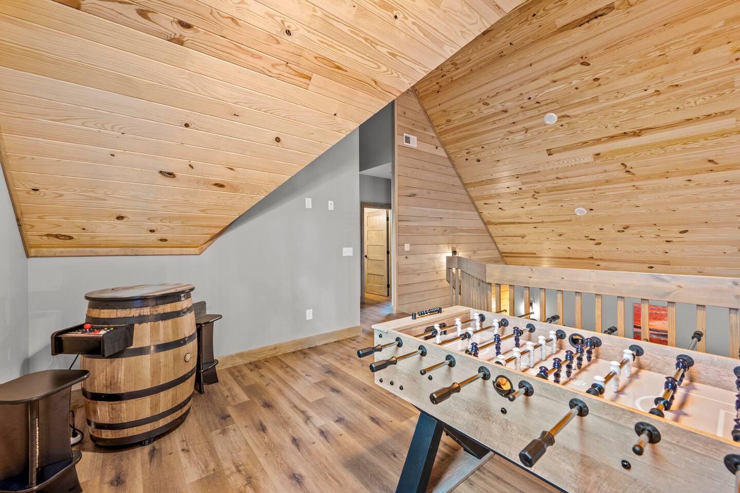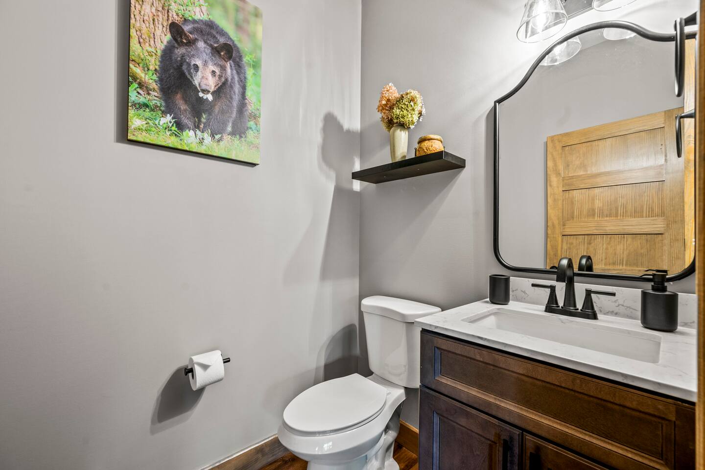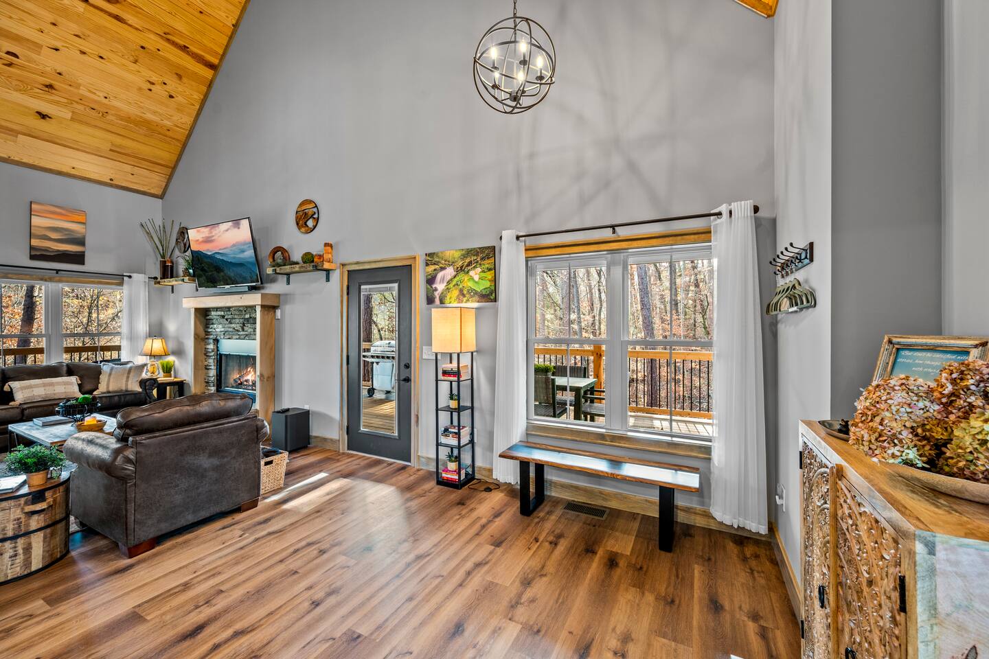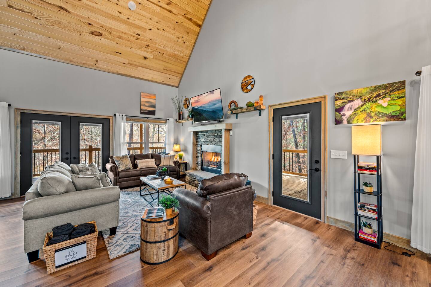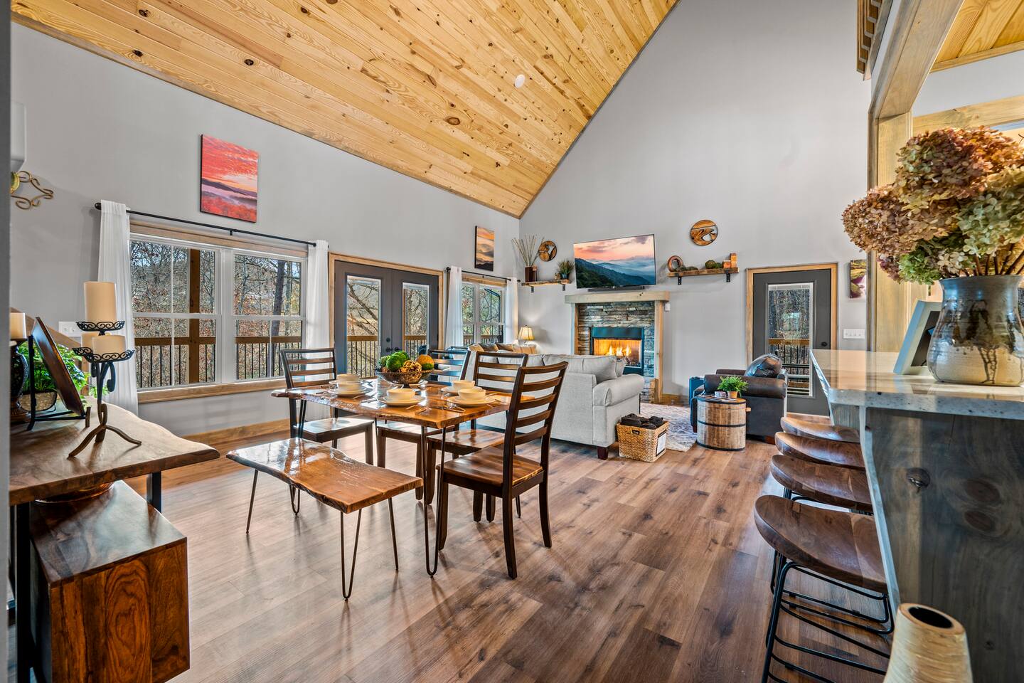 🌄 MYTHS OF THE MOUNTAIN | Wears Valley Retreat 🌄 ⭐ Featured Highlights • 3 Bedroom - Sleeps 8 • Panoramic mountain & valley views from nearly 1,000 sq ft of deck space • Easy paved access with LEVEL parking for up to 4 vehicles • Luxury hot tub with Bluetooth speakers & waterfall jets • Game loft with foosball + 60-game retro arcade • Community Pool Access (≈10 minutes away) • Gas fireplace, fire pit table & outdoor wood-burning fireplace • Prime location: 5 miles to the Smokies, minutes to Cades Cove • Starlink high-speed internet for remote work Peaceful, private setting with year-round accessibility Nestled in the heart of scenic Wears Valley, Myths of the Mountain offers a peaceful escape from everyday life while keeping you close to the best of the Smoky Mountains. Surrounded by sweeping views and quiet countryside, this thoughtfully designed cabin blends luxury, comfort, and convenience—making it a place guests love to return to year after year. Getting here is refreshingly easy. Paved roads lead directly to the cabin, where level parking for up to four vehicles eliminates the stress of steep mountain driveways. As you arrive, you’re greeted by stunning views of Cove Mountain, setting the tone for a relaxing stay from the moment you pull in. Inside, natural light fills the open living space through oversized picture windows that frame the mountains like living artwork. Comfortable leather and fabric seating invites you to relax by the gas fireplace, while the 65” 4K Roku TV paired with a JBL soundbar and subwoofer creates a cinematic experience for movie nights. The walls are adorned with striking canvas photography by National Geographic photographer Bill Lea, adding a unique local touch to the space. The gourmet kitchen flows seamlessly into the living and dining areas, making it perfect for gathering. It’s fully equipped with Calphalon cookware, a generous selection of small appliances, and thoughtful pantry staples to get you started. Whether you’re enjoying a quick breakfast at the bar, a family dinner at the dining table, or preparing a holiday meal with the oversized All-Clad turkey roaster, everything you need is right at hand. The main-level king suite feels like a private spa retreat. This spacious bedroom features French doors that open onto the deck, allowing you to wake up to panoramic valley views. The en-suite bathroom includes a double vanity, walk-in shower, and a freestanding soaking tub—perfect for unwinding after a day of hiking or sightseeing. Upstairs, the queen bedroom offers a quiet and comfortable space with blackout curtains, mountain views, and private access to a shared hall bathroom with a double vanity and tub/shower combo. The twin room is ideal for kids or extra guests, featuring a cozy reading nook, games, puzzles, and a calm, screen-free atmosphere. The loft game room is a guest favorite, offering hours of entertainment for all ages. Foosball, a bourbon-barrel arcade loaded with classic 1980s games, and a variety of board and card games make it the perfect spot for family game nights or rainy afternoons. Outdoor living truly shines here. The expansive deck invites you to dine, lounge, and relax while soaking in uninterrupted mountain views. Fire up the gas grill, enjoy evenings around the fire pit table under glowing Edison lights, or melt your stress away in the luxury hot tub complete with Bluetooth audio and full-body hydrotherapy jets. With a dedicated 100-gallon propane tank, you’ll never run out mid-grill or mid-fire. The spacious yard adds even more room to unwind. Play a game of cornhole, nap in the double hammock, browse the outdoor reading library, or gather around the wood-burning fireplace in Adirondack chairs for cozy nights under the stars. For longer stays or working vacations, the cabin includes a full laundry room and Starlink high-speed internet, making it easy to stay connected while enjoying a true mountain retreat. And when you’re ready for more, you’ll also have access to a nearby community pool just about 10 minutes away—a perfect bonus during warmer months. Myths of the Mountain is more than a cabin—it’s a place to slow down, reconnect, and create lasting memories in one of the most beautiful valleys in the Smokies.