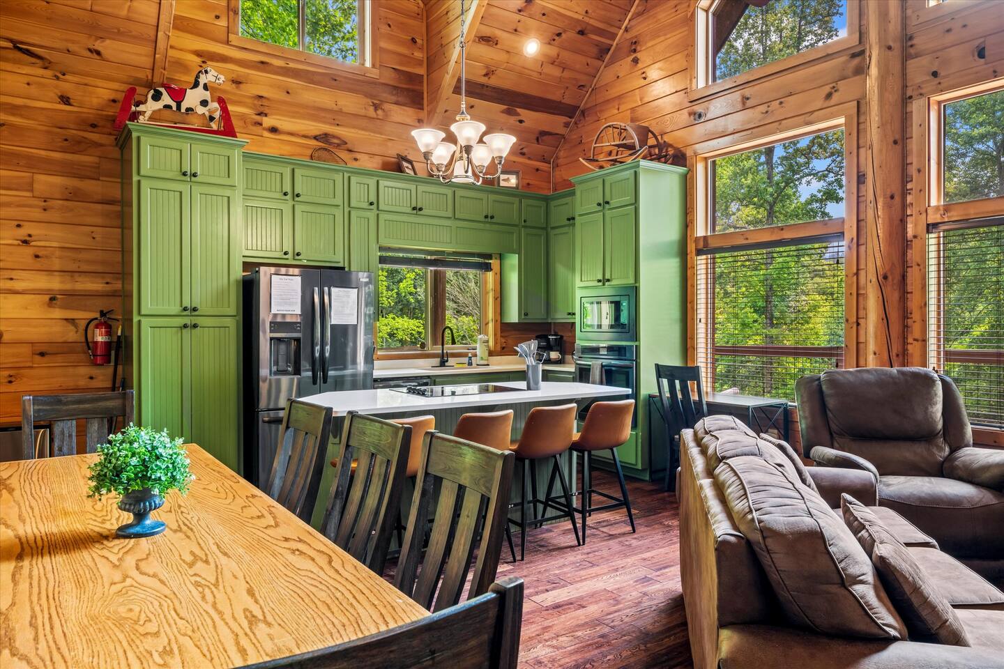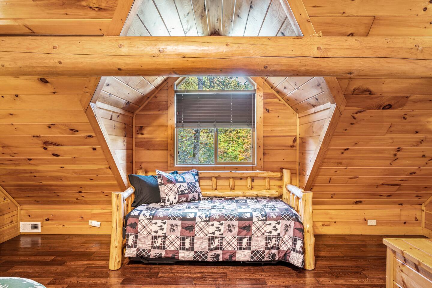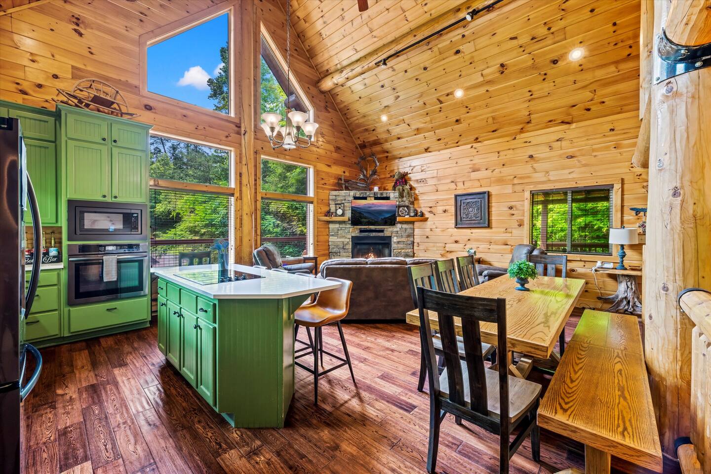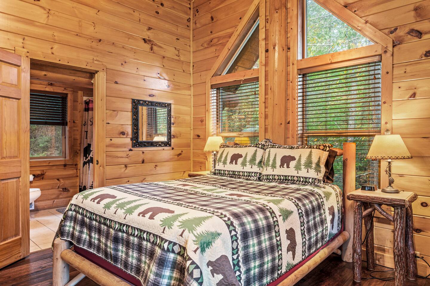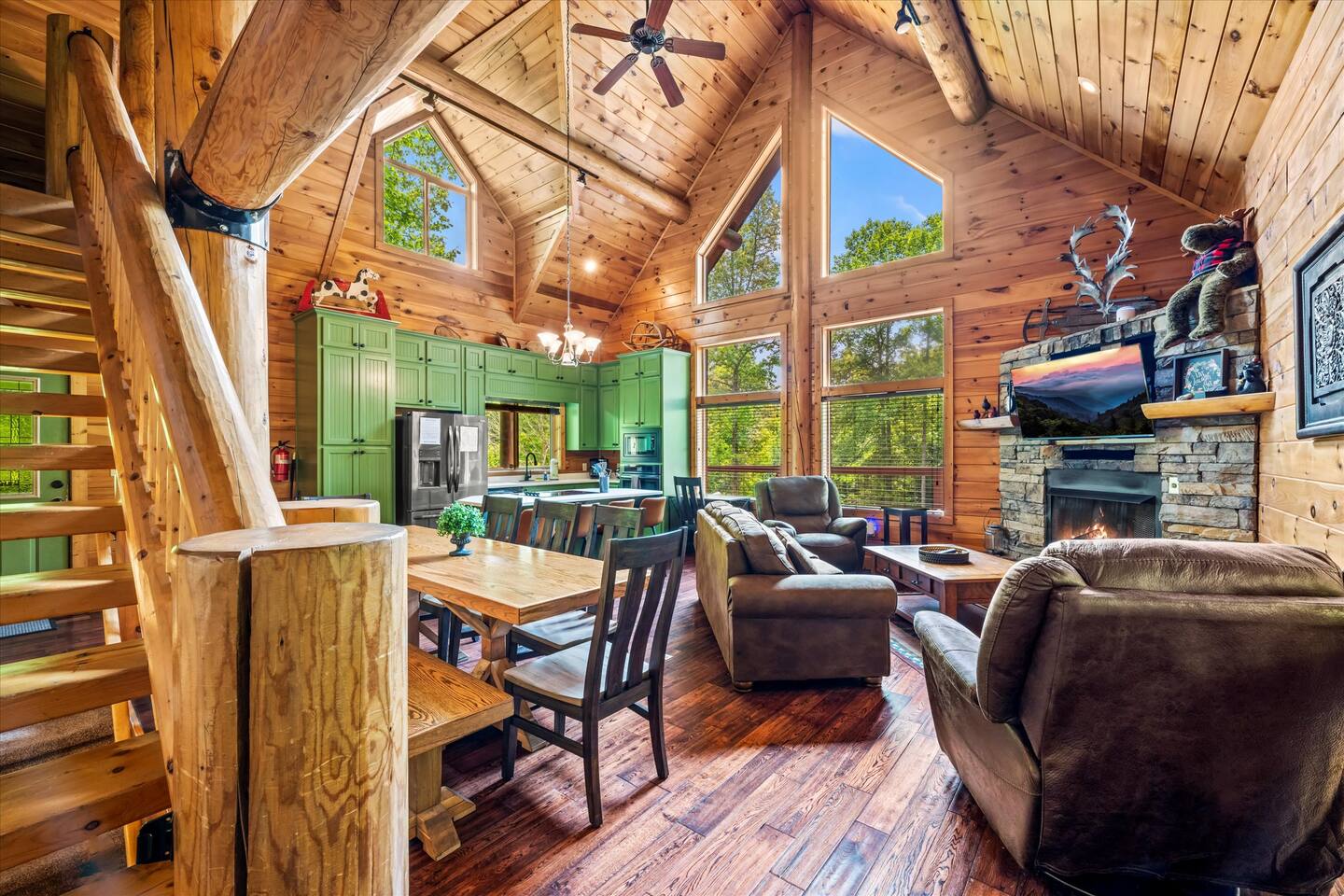 This spacious, three-bedroom plus a loft cabin is right near the northern edge of the Smoky Mountains National Park for hiking, mountain biking, and many other wilderness activities. This cabin is positively aglow with rich, hardwood floors, knotty pine walls, and vaulted ceilings. The open living area has a plush leather sofa, twin recliners, and a stone-face gas fireplace. Features 4 TVs, WiFi, Cable, Pool Table, outdoor hot tub and an amazing deck to watch those beautiful TN sunsets.